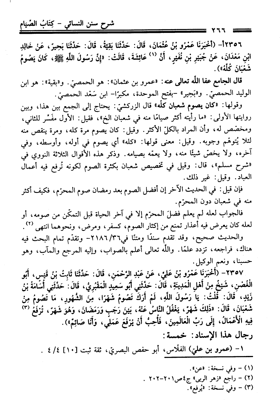 2356 أ- (أَخْبَرَنَا عَمْرُو بْنُ عُثْمَانَ, قَالَ: حَدَّثَنَا بَقِيَّةُ, قَالَ: حَدَّثَنَا بَحِيرٌ, عَنْ خَالِدِ بْنِ مَعْدَانَ, عَنْ جُبَيْرِ بْنِ نُفَيْرٍ, أَنَّ (¬1) عَائِشَةَ, قَالَتْ: "إِنَّ رَسُولَ اللَّهِ - صلى اللَّه عليه وسلم -, كَانَ يَصُومُ شَعْبَانَ كُلَّهُ").