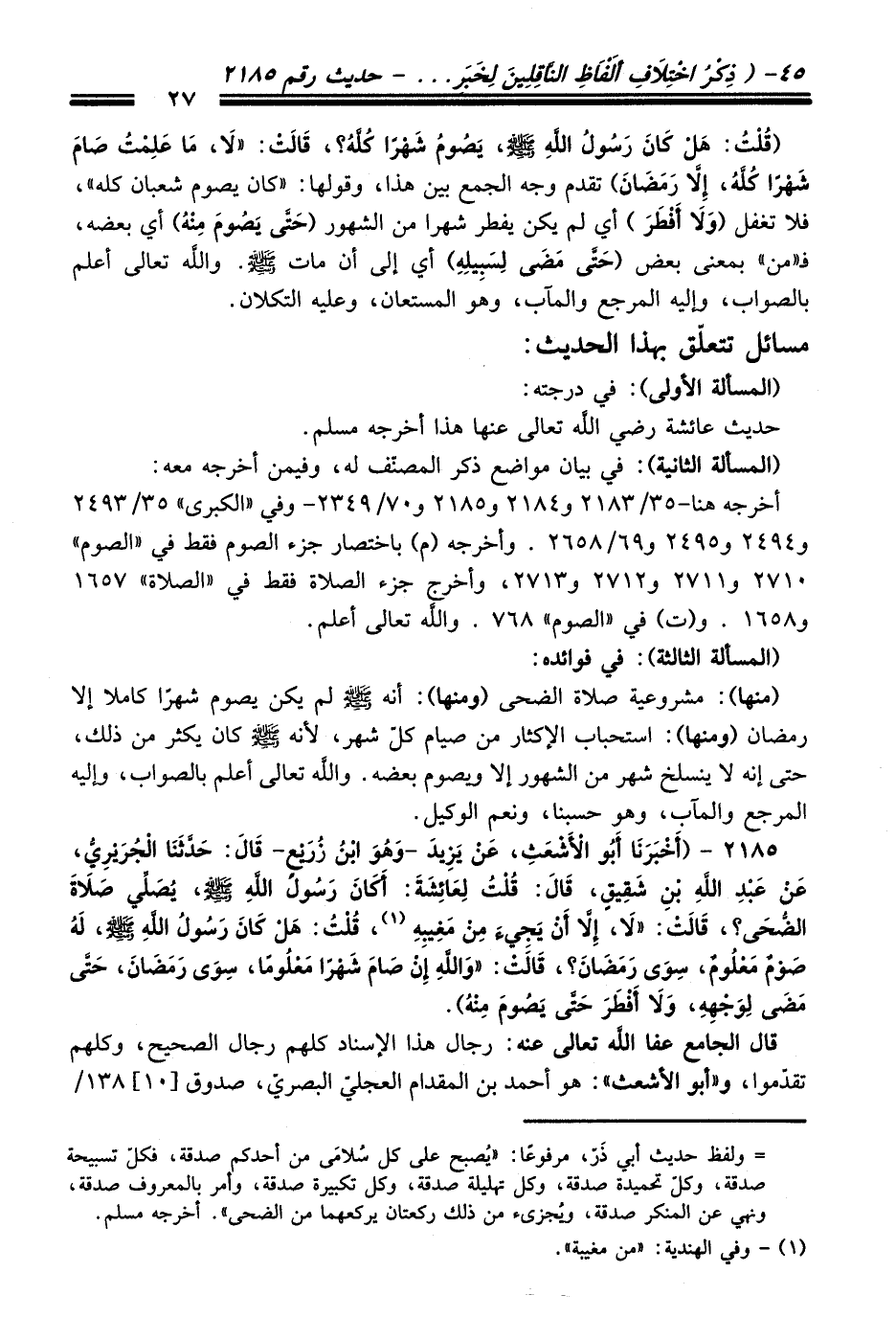 2185 - (أَخْبَرَنَا أَبُو الأَشْعَثِ, عَنْ يَزِيدَ -وَهُوَ ابْنُ زُرَيْعٍ- قَالَ: حَدَّثَنَا الْجُرَيْرِيُّ, عَنْ عَبْدِ اللَّهِ بْنِ شَقِيقٍ, قَالَ: قُلْتُ لِعَائِشَةَ: أَكَانَ رَسُولُ اللَّهِ - صلى اللَّه عليه وسلم - يُصَلِّي صَلاَةَ الضُّحَى؟ , قَالَتْ: "لاَ إِلاَّ أَنْ يَجِيءَ مِنْ مَغِيبِهِ (¬1) , قُلْتُ: هَلْ كَانَ رَسُولُ اللَّهِ - صلى اللَّه عليه وسلم -, لَهُ صَوْمٌ مَعْلُومٌ, سِوَى رَمَضَانَ؟ , قَالَتْ: وَاللَّهِ إِنْ صَامَ شَهْرًا مَعْلُومًا, سِوَى رَمَضَانَ, حَتَّى مَضَى لِوَجْهِهِ, وَلاَ أَفْطَرَ حَتَّى يَصُومَ مِنْهُ").