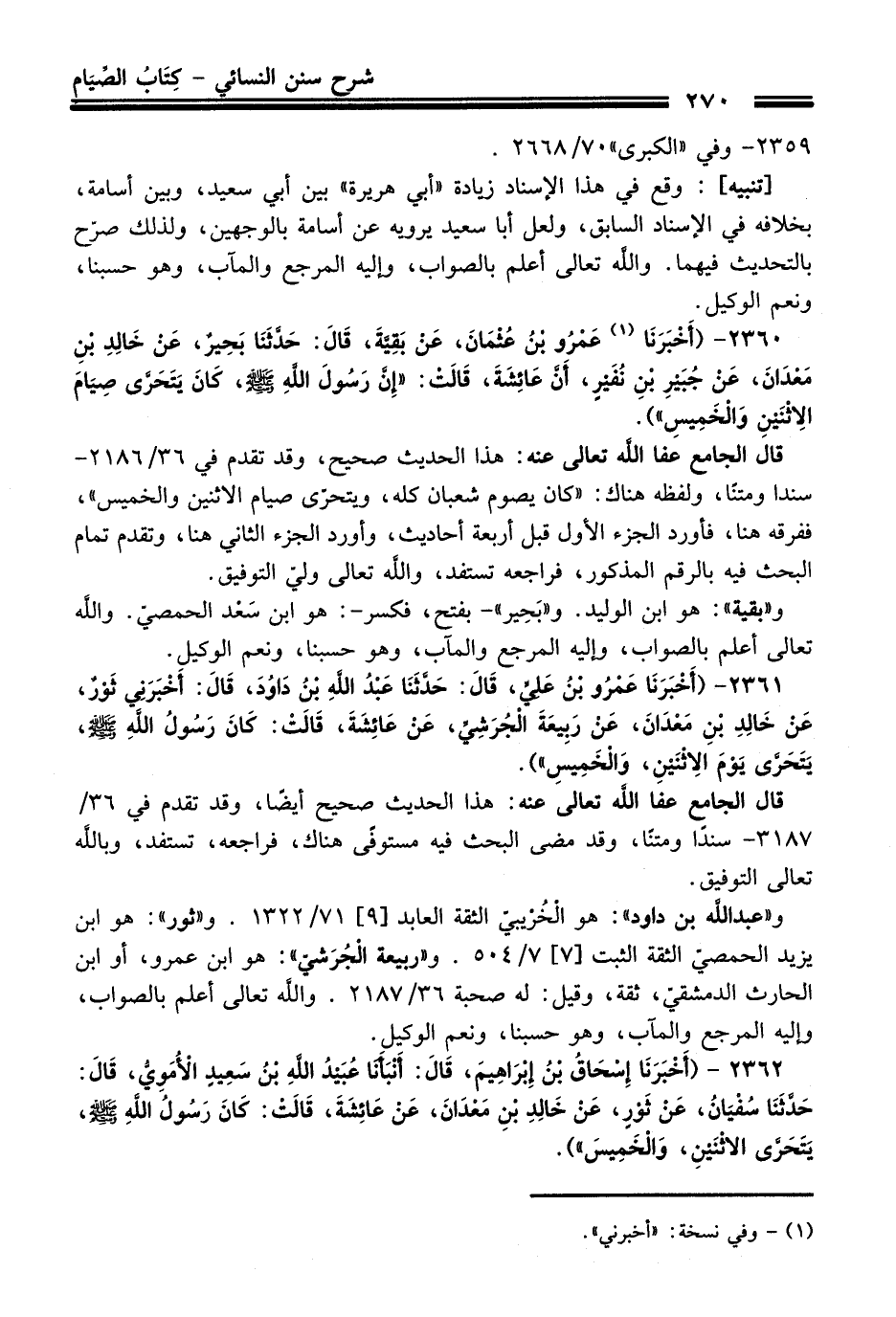 2361 - (أَخْبَرَنَا عَمْرُو بْنُ عَلِيٍّ,, قَالَ: حَدَّثَنَا عَبْدُ اللَّهِ بْنُ دَاوُدَ, قَالَ: أَخْبَرَنِي ثَوْرٌ, عَنْ خَالِدِ بْنِ مَعْدَانَ, عَنْ رَبِيعَةَ الْجُرَشِيِّ, عَنْ عَائِشَةَ, قَالَتْ: كَانَ رَسُولُ اللَّهِ - صلى اللَّه عليه وسلم -, يَتَحَرَّى يَوْمَ الاِثْنَيْنِ, وَالْخَمِيسِ).