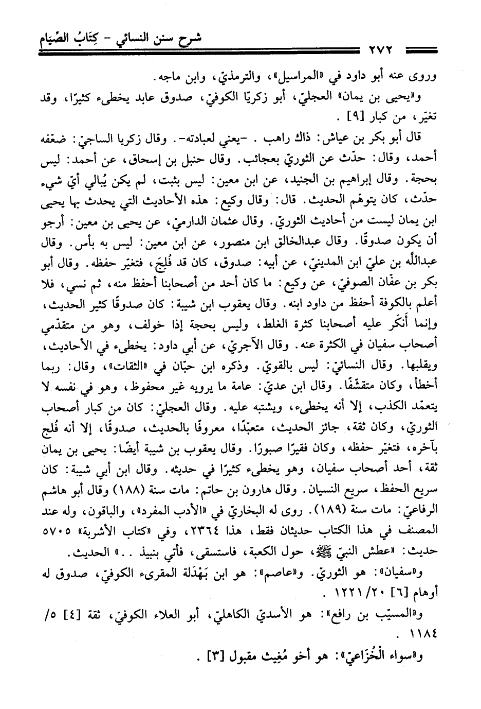 قال أبو بكر بن عياش: ذاك راهب. -يعني لعبادته-. وقال زكريا الساجيّ: ضعّفه أحمد، وقال: حدّث عن الثوريّ بعجائب. وقال حنبل بن إسحاق، عن أحمد: ليس بحجة. وقال إبراهيم بن الجنيد، عن ابن معين: ليس بثبت، لم يكن يُبالي أيّ شيء حدّث، كان يتوهّم الحديث. قال: وقال وكيع: هذه الأحاديث التي يحدث بها يحيى ابن يمان ليست من أحاديث الثوريّ. وقال عثمان الدارميّ، عن يحيى بن معين: أرجو أن يكون صدوقًا. وقال عبد الخالق ابن منصور، عن ابن معين: ليس به بأس. وقال عبد اللَّه بن عليّ ابن المدينيّ، عن أبيه: صدوق، كان قد فُلِجَ، فتغيّر حفظه. وقال أبو بكر بن عفّان الصوفيّ، عن وكيع: ما كان أحد من أصحابنا أحفظ منه، ثم نسي، فلا أعلم بالكوفة أحفظ من داود ابنه. وقال يعقوب ابن شيبة: كان صدوقًا كثير الحديث، وإنما أَنكَر عليه أصحابنا كثرة الغلط، وليس بحجة إذا خولف، وهو من متقدّمي أصحاب سفيان في الكثرة عنه. وقال الآجريّ، عن أبي داود: يخطئ في الأحاديث، ويقلبها. وقال النسائيّ: ليس بالقويّ. وذكره ابن حبّان في "الثقات"، وقال: ربما أخطأ، وكان متقشّفًا. وقال ابن عديّ: عامة ما يرويه غير محفوظ، وهو في نفسه لا يتعمّد الكذب، إلا أنه يخطئ، ويشتبه عليه. وقال العجليّ: كان من كبار أصحاب الثوريّ، وكان ثقة، جائز الحديث، متعبدًا، معروفًا بالحديث، صدوقًا، إلا أنه فُلج بآخره، فتغيّر حفظه، وكان فقيرًا صبورًا. وقال يعقوب بن شيبة أيضًا: يحيى بن يمان ثقة، أحد أصحاب سفيان، وهو يخطئ كثيرًا في حديثه. وقال ابن أبي شيبة: كان سريع الحفظ، سريع النسيان. وقال هارون بن حاتم: مات سنة (188) وقال أبو هاشم الرفاعيّ: مات سنة (189). روى له البخاريّ في "الأدب المفرد"، والباقون، وله عند المصنف في هذا الكتاب حديثان فقط، هذا 2364، وفي "كتاب الأشربة" 5705 حديث: "عطش النبيّ - صلى اللَّه عليه وسلم -، حول الكعبة، فاستسقى، فأتي بنبيذ .. " الحديث.