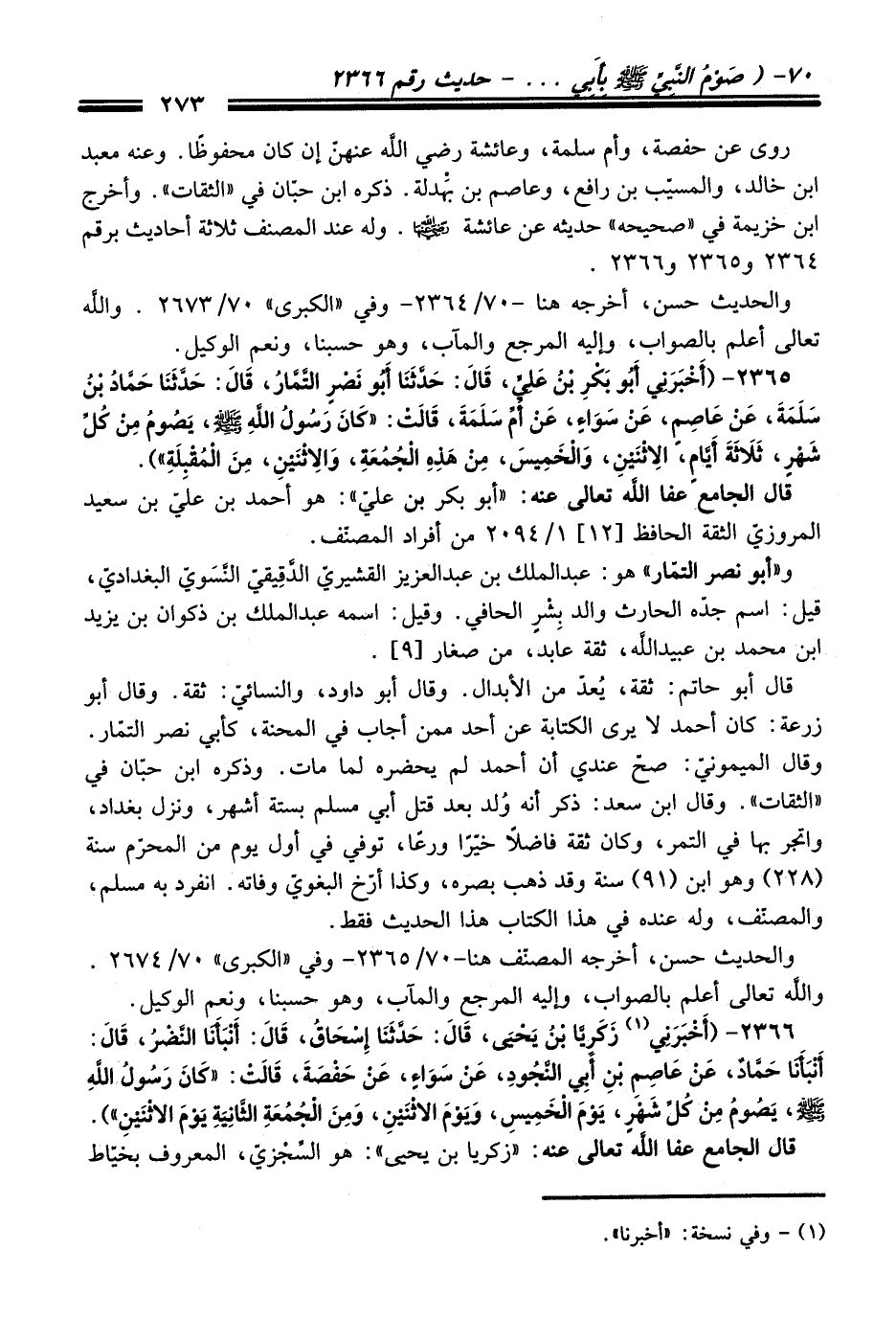 2366 - (أَخْبَرَنِي (¬1) زَكَرِيَّا بْنُ يَحْيَى, قَالَ: حَدَّثَنَا إِسْحَاقُ, قَالَ: أَنْبَأَنَا النَّضْرُ, قَالَ: أَنْبَأَنَا حَمَّادٌ, عَنْ عَاصِمِ بْنِ أَبِي النَّجُودِ, عَنْ سَوَاءٍ, عَنْ حَفْصَةَ, قَالَتْ: "كَانَ رَسُولُ اللَّهِ - صلى اللَّه عليه وسلم -, يَصُومُ مِنْ كُلِّ شَهْرٍ, يَوْمَ الْخَمِيسِ, وَيَوْمَ الاِثْنَيْنِ, وَمِنَ الْجُمُعَةِ الثَّانِيَةِ يَوْمَ الاِثْنَيْنِ").