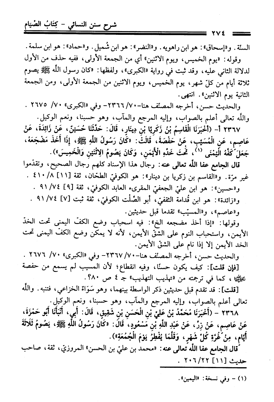 2367 أ- (أَخْبَرَنَا الْقَاسِمُ بْنُ زَكَرِيَّا بْنِ دِينَارٍ, قَالَ: حَدَّثَنَا حُسَيْنٌ, عَنْ زَائِدَةَ, عَنْ عَاصِمٍ عَنِ الْمُسَيَّبِ, عَنْ حَفْصَةَ, قَالَتْ: "كَانَ رَسُولُ اللَّهِ - صلى اللَّه عليه وسلم -, إِذَا أَخَذَ مَضْجَعَهُ, جَعَلَ كَفَّهُ الْيُمْنَى (¬1) , تَحْتَ خَدِّهِ الأَيْمَنِ, وَكَانَ يَصُومُ الاِثْنَيْنَ وَالْخَمِيسَ").