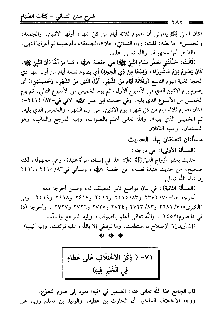 "كان النبيّ - صلى اللَّه عليه وسلم -يأمرني أن أصوم ثلاثة أيام من كلّ شهر، أوّلها الاثنين، والجمعة، والخميس": ما نصّه: قلت: رواه النسائيّ، خلا "والجمعة"، وأم هنيدة لم أعرفها انتهى. فالظاهر أنها مجهولة. واللَّه تعالى أعلم.