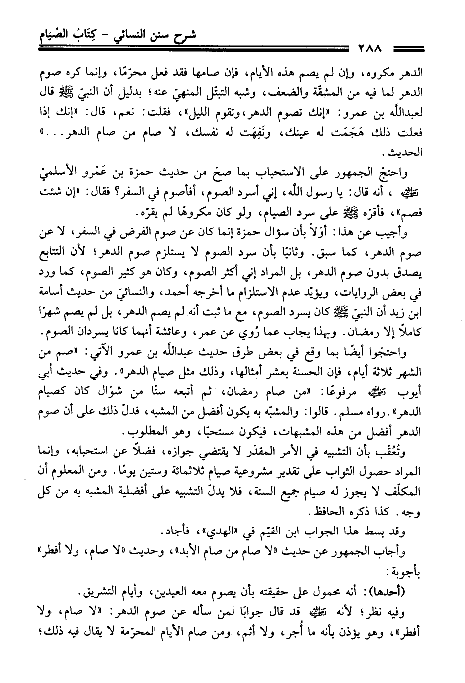 وأجيب عن هذا: أولاً بأن سؤال حمزة إنما كان عن صوم الفرض في السفر، لا عن صوم الدهر، كما سبق. وثانيًا بأن سرد الصوم لا يستلزم صوم الدهر؛ لأن التتابع يصدق بدون صوم الدهر، بل المراد إني أكثر الصوم، وكان هو كثير الصوم، كما ورد في بعض الروايات، ويؤيّد عدم الاستلزام ما أخرجه أحمد، والنسائيّ من حديث أسامة ابن زيد أن النبيّ - صلى اللَّه عليه وسلم - كان يسرد الصوم، مع ما ثبت أنه لم يصم الدهر، بل لم يصم شهرًا كاملاً إلا رمضان. وبهذا يجاب عما رُوي عن عمر، وعائشة أنهما كانا يسردان الصوم.