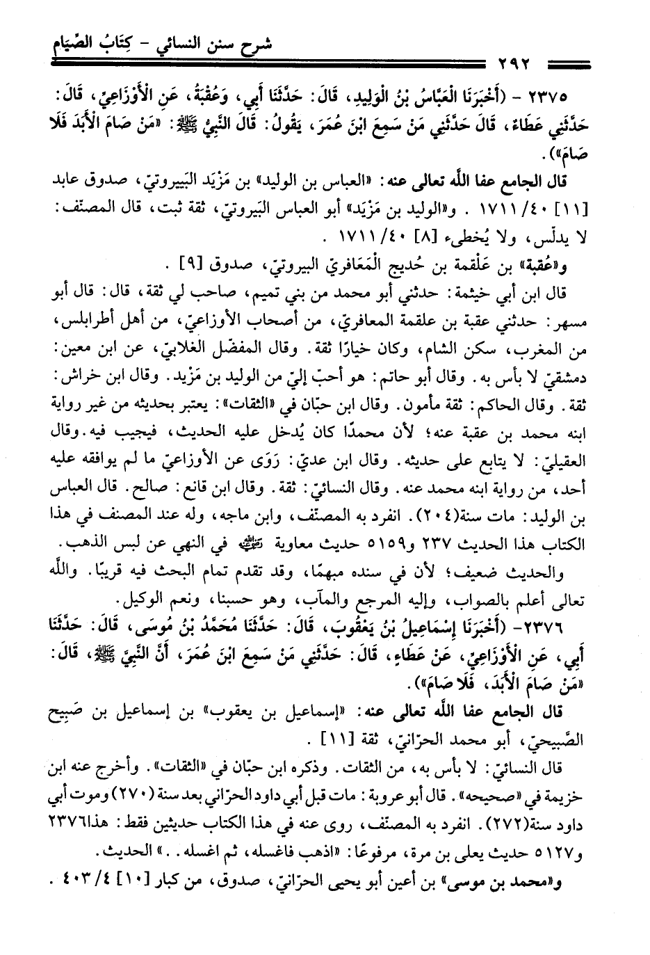 2375 - (أَخْبَرَنَا الْعَبَّاسُ بْنُ الْوَلِيدِ, قَالَ: حَدَّثَنَا أَبِي, وَعُقْبَةُ, عَنِ الأَوْزَاعِيِّ, قَالَ: حَدَّثَنِي عَطَاءٌ, قَالَ: حَدَّثَنِي مَنْ سَمِعَ ابْنَ عُمَرَ, يَقُولُ: قَالَ: النَّبِيُّ - صلى اللَّه عليه وسلم -: «مَنْ صَامَ الأَبَدَ فَلاَ صَامَ»).