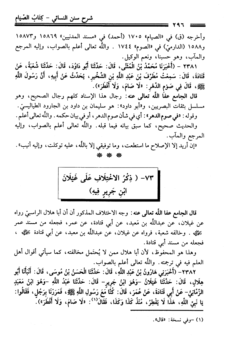 2382 - (أَخْبَرَنِي هَارُونُ بْنُ عَبْدِ اللَّهِ, قَالَ: حَدَّثَنَا الْحَسَنُ بْنُ مُوسَى, قَالَ: أَنْبَأَنَا أَبُو هِلاَلٍ, قَالَ: حَدَّثَنَا غَيْلاَنُ -وَهُوَ ابْنُ جَرِيرٍ- قَالَ: حَدَّثَنَا عَبْدُ اللَّهِ -وَهُوَ ابْنُ مَعْبَدٍ الزِّمَّانِيُّ- عَنْ أَبِي قَتَادَةَ, عَنْ عُمَرَ, قَالَ: كُنَّا مَعَ رَسُولِ اللَّهِ - صلى اللَّه عليه وسلم -, فَمَرَرْنَا بِرَجُلٍ, فَقَالُوا: يَا نَبِيَّ اللَّهِ, هَذَا لاَ يُفْطِرُ, مُنْذُ كَذَا وَكَذَا, فَقَالَ (¬1): «لاَ صَامَ, وَلاَ أَفْطَرَ»).