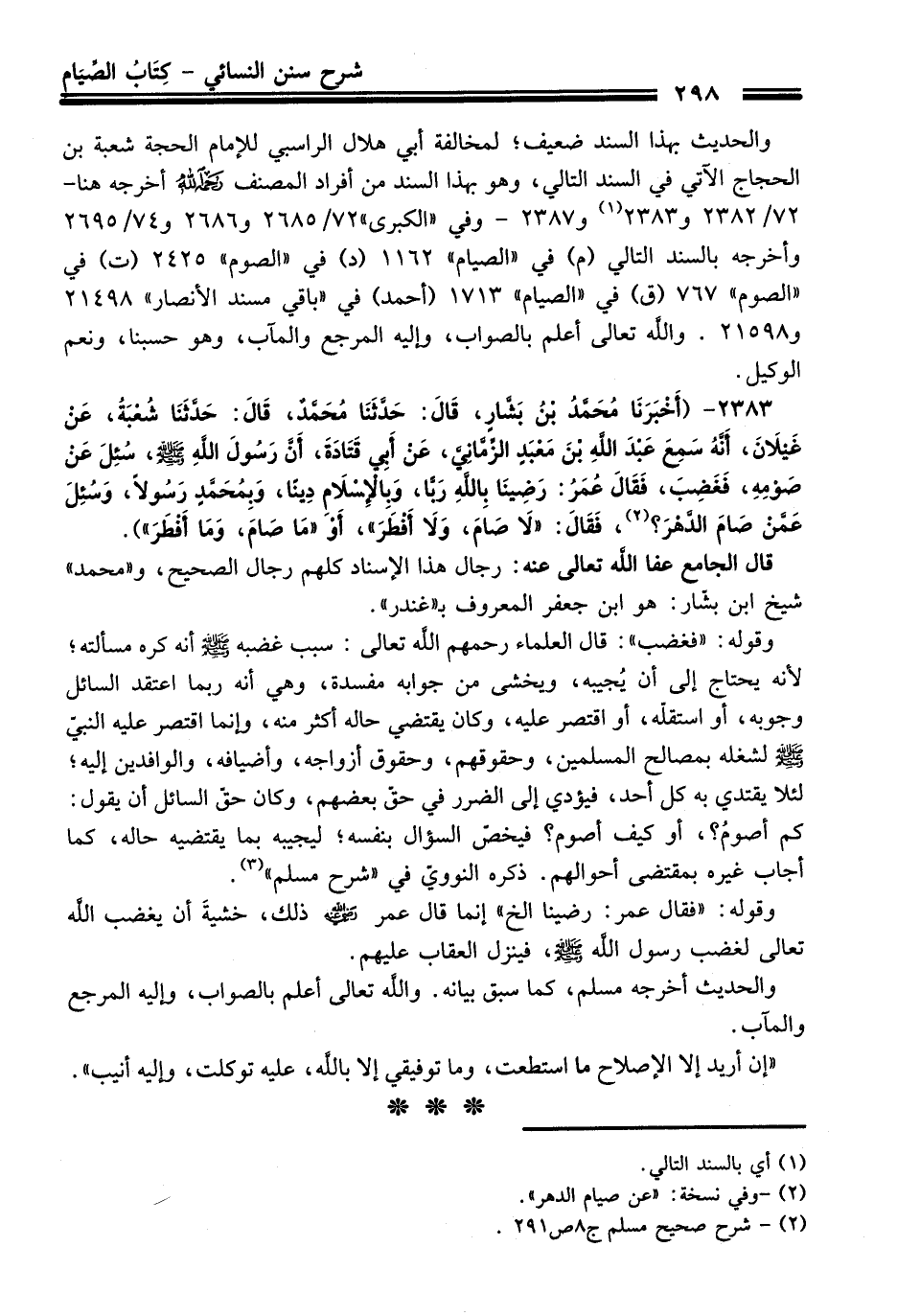 2383 - (أَخْبَرَنَا مُحَمَّدُ بْنُ بَشَّارٍ, قَالَ: حَدَّثَنَا مُحَمَّدٌ, قَالَ: حَدَّثَنَا شُعْبَةُ, عَنْ غَيْلاَنَ, أَنَّهُ سَمِعَ عَبْدَ اللَّهِ بْنَ مَعْبَدٍ الزِّمَّانِيَّ, عَنْ أَبِي قَتَادَةَ, أَنَّ رَسُولَ اللَّهِ - صلى اللَّه عليه وسلم -, سُئِلَ عَنْ صَوْمِهِ, فَغَضِبَ, فَقَالَ: عُمَرُ: رَضِينَا بِاللَّهِ رَبًّا, وَبِالإِسْلاَمِ دِينًا, وَبِمُحَمَّدٍ رَسُولاً, وَسُئِلَ عَمَّنْ صَامَ الدَّهْرَ؟ (¬2) , فَقَالَ: "لاَ صَامَ, وَلاَ أَفْطَرَ", أَوْ "مَا صَامَ, وَمَا أَفْطَرَ").