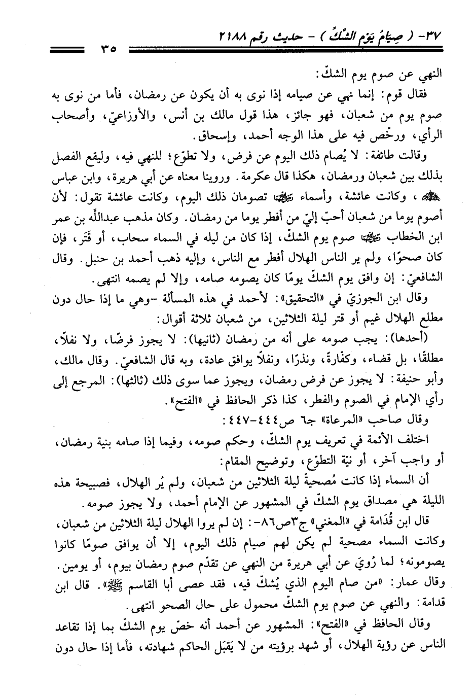 وقال الحافظ في "الفتح": المشهور عن أحمد أنه خصّ يوم الشكّ بما إذا تقاعد الناس عن رؤية الهلال، أو شهد برؤيته من لا يَقبَل الحاكم شهادته، فأما إذا حال دون