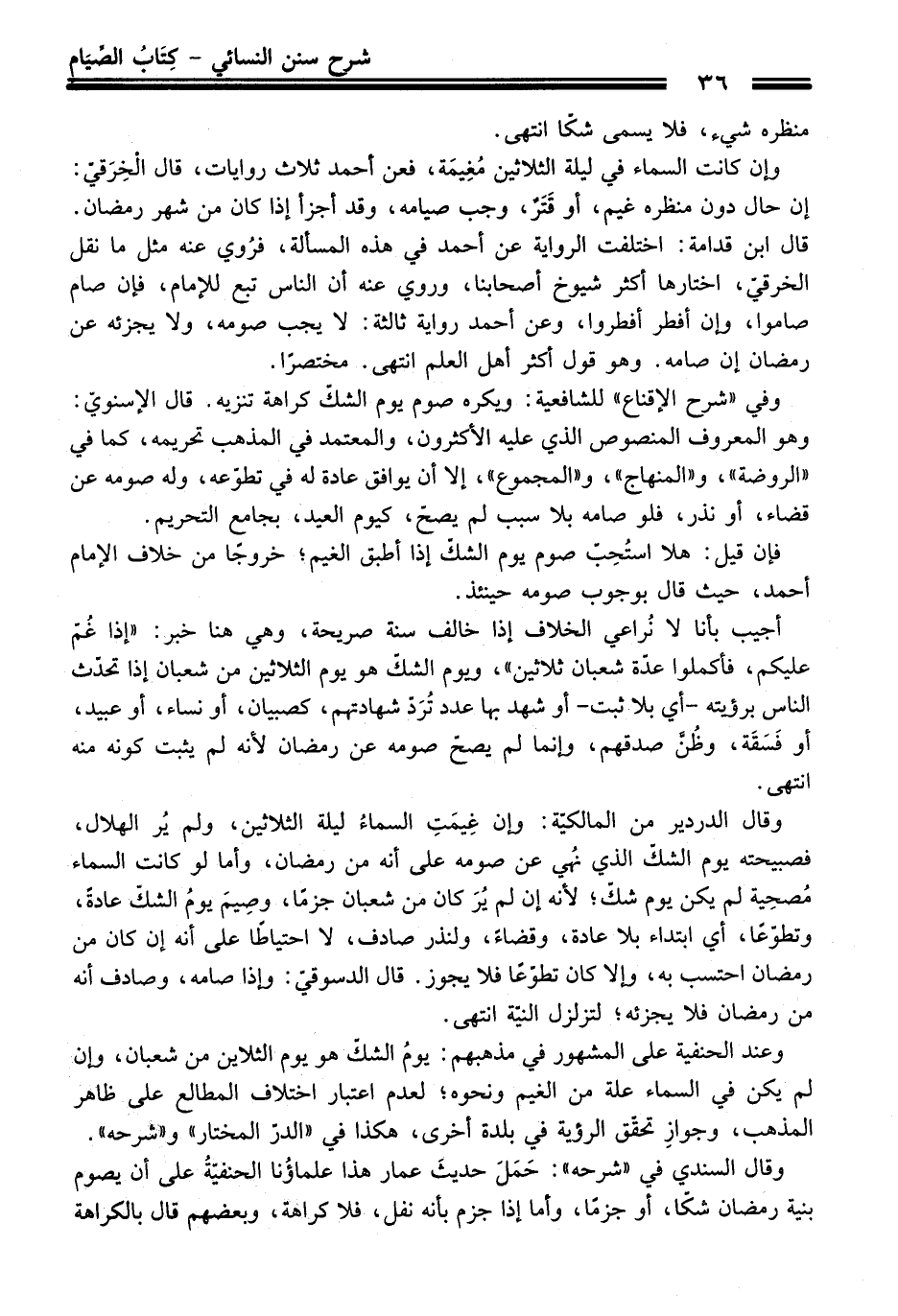 أجيب بأنا لا نُراعي الخلاف إذا خالف سنة صريحة، وهي هنا خبر: "إذا غُمّ عليكم، فأكملوا عدّة شعبان ثلاثين "، ويوم الشكّ هو يوم الثلاثين من شعبان إذا تحدّث الناس برؤيته -أي بلا ثبت- أو شهد بها عدد تُرَدّ شهادتهم، كصبيان، أو نساء، أو عبيد، أو فَسَقَة، وظُنَّ صدقهم، وإنما لم يصحّ صومه عن رمضان لأنه لم يثبت كونه منه انتهى.