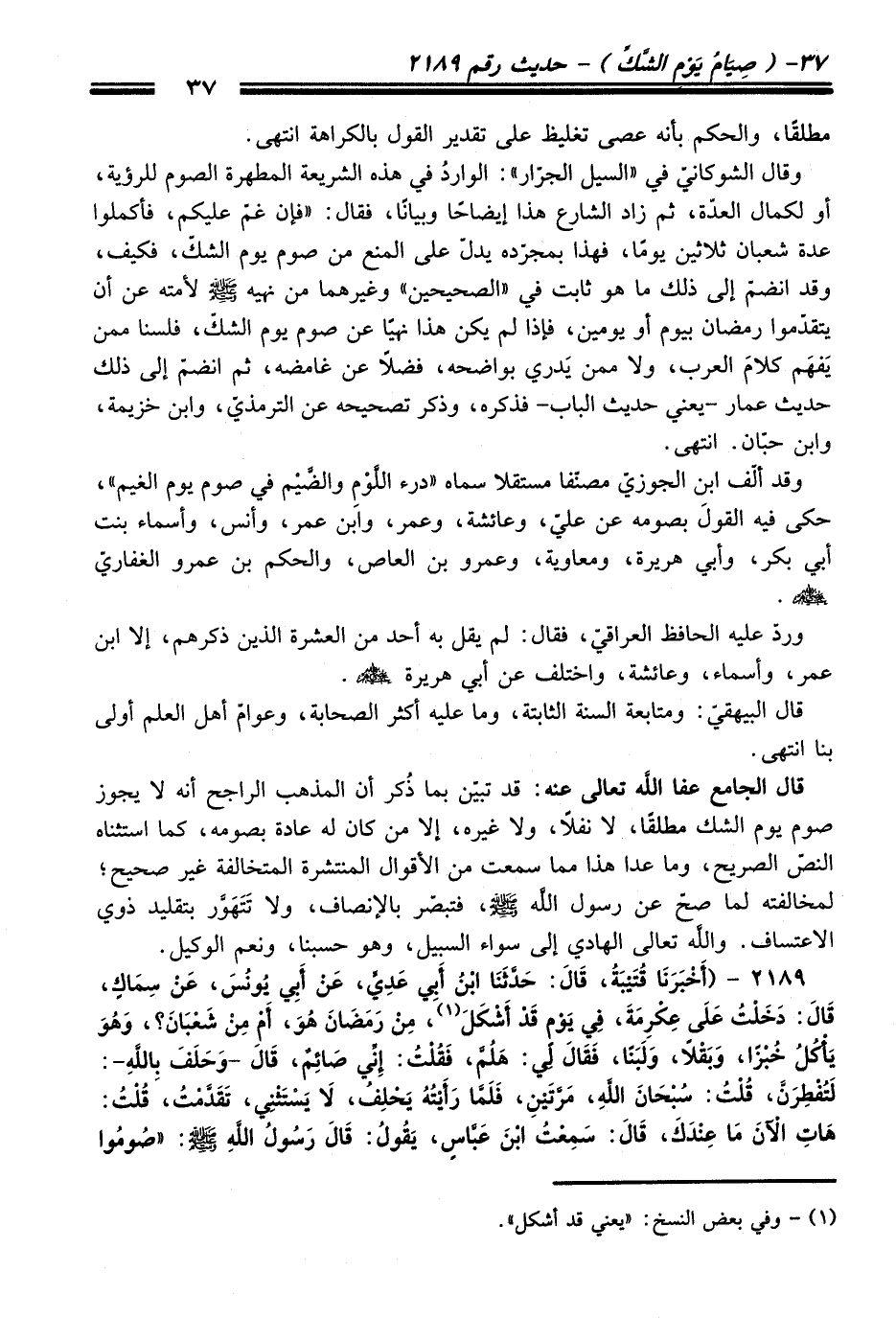 قال الجامع - عفا اللَّه تعالى عنه -: قد تبيّن بما ذُكر أن المذهب الراجح أنه لا يجوز صوم يوم الشكّ مطلقًا، لا نفلاً، ولا غيره، إلا من كان له عادة بصومه، كما استثناه النصّ الصريح، وما عدا هذا مما سمعت من الأقوال المنتشرة المتخالفة غير صحيح؛ لمخالفته لما صحّ عن رسول اللَّه - صلى اللَّه عليه وسلم -، فتبصّر بالإنصاف، ولا تَتَهَوَّر بتقليد ذوي الاعتساف. واللَّه تعالى الهادي إلى سواء السبيل، وهو حسبنا، ونعم الوكيل.