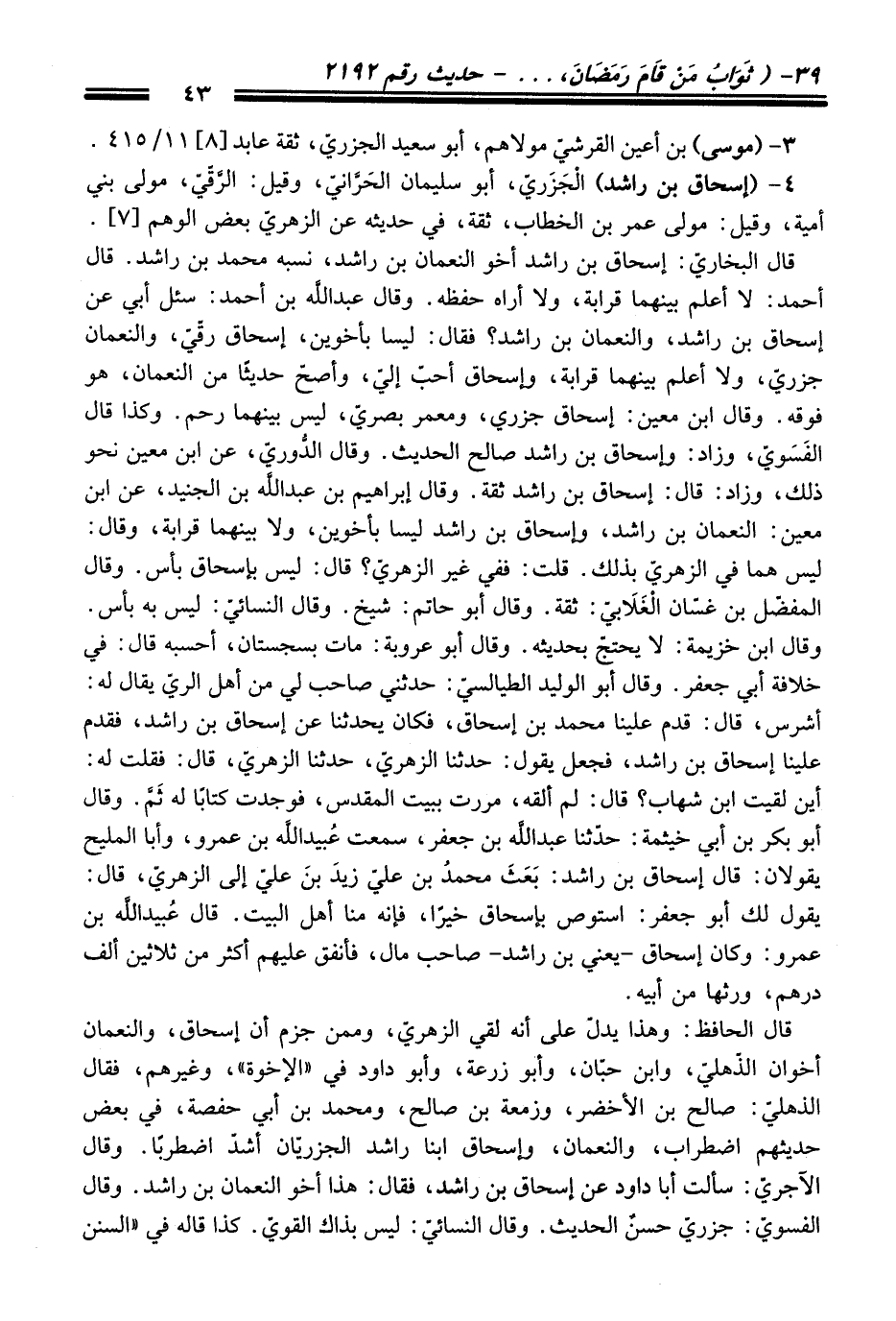قال الحافظ: وهذا يدلّ على أنه لقي الزهريّ، وممن جزم أن إسحاق، والنعمان أخوان الذّهليّ، وابن حبّان، وأبو زرعة، وأبو داود في "الإخوة"، وغيرهم، فقال الذهليّ: صالح بن الأخضر، وزمعة بن صالح، ومحمد بن أبي حفصة، في بعض حديثهم اضطراب، والنعمان، وإسحاق ابنا راشد الجزريّان أشدّ اضطربًا. وقال الآجريّ: سألت أبا داود عن إسحاق بن راشد، فقال: هذا أخو النعمان بن راشد. وقال الفسويّ: جزريّ حسنٌ الحديث. وقال النسائيّ: ليس بذاك القويّ. كذا قاله في "السنن