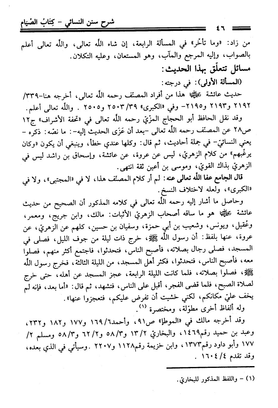 وحاصل ما أشار إليه -رحمه اللَّه تعالى- في كلامه المذكور أن الصحيح من حديث عائشة - رضي اللَّه عنها - هو ما ساقه أصحاب الزهريّ الأثبات: مالك، وابن جريج، ومعمر، وعُقيل، ويونس، وشعيب بن أبي حمزة، وسفيان بن حسين، كلهم عن الزهريّ، عن عروة، عنها بلفظ: أن رسول اللَّه - صلى اللَّه عليه وسلم -، خرج ذات ليلة من جوف الليل، فصلى في المسجد، فصلى رجال بصلاته، فأصبح الناس، فتحدثوا، فاجتمع أكثر منهم، فصلوا معه، فأصبح الناس، فتحدثوا، فأكثر أهل المسجد، من الليلة الثالثة، فخرج رسول اللَّه - صلى اللَّه عليه وسلم -، فصلوا بصلاته، فلما كانت الليلة الرابعة، عجز المسجد عن أهله، حتى خرج لصلاة الصبح، فلما قضى الفجر، أقبل على الناس، فتشهد، ثم قال: "أما بعد، فإنه لم يخف عليّ مكانكم، لكني خشيت أن تفرض عليكم، فتعجزوا عنها".