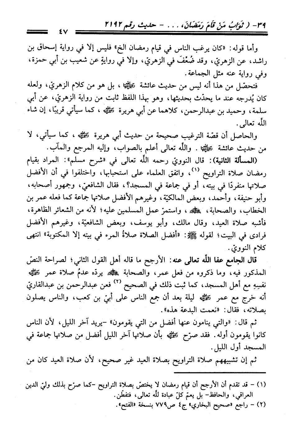 (¬1) - قد تقدّم أن الأرجح أن قيام رمضان لا يختصّ بصلاة التراويح -كما صرّح بذلك وليّ الدين العراقيّ، والحافظ- بل يعمّ كلّ عبادة للَّه تعالى، فتفطّن.