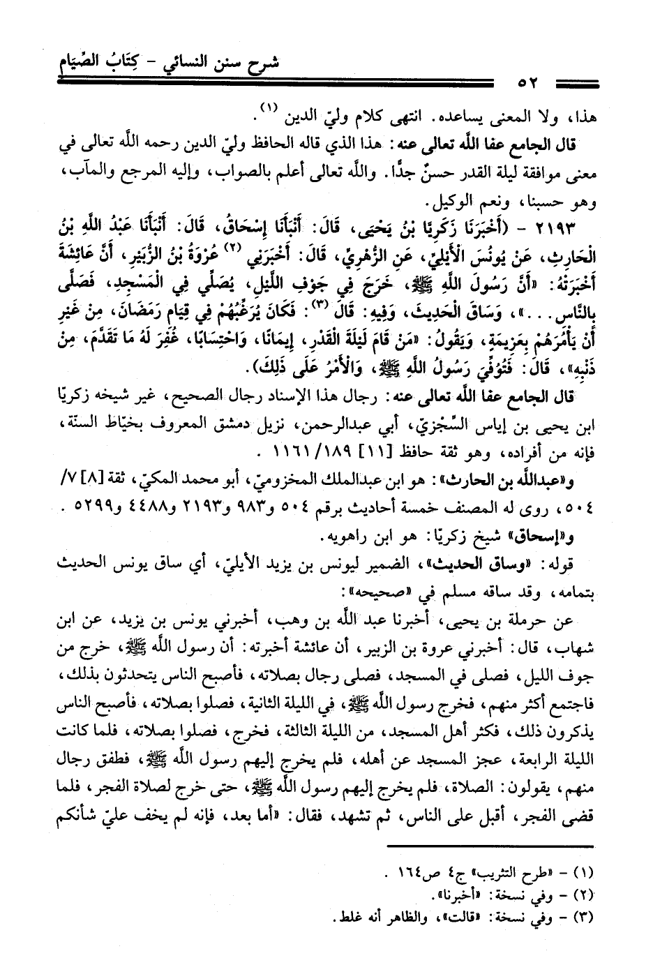 2293 - (أَخْبَرَنَا زَكَرِيَّا بْنُ يَحْيَى, قَالَ: أَنْبَأَنَا إِسْحَاقُ, قَالَ: أَنْبَأَنَا عَبْدُ اللَّهِ بْنُ الْحَارِثِ, عَنْ يُونُسَ الأَيْلِيِّ, عَنِ الزُّهْرِيِّ, قَالَ: أَخْبَرَنِي (¬2) عُرْوَةُ بْنُ الزُّبَيْرِ, أَنَّ عَائِشَةَ أَخْبَرَتْهُ: "أَنَّ رَسُولَ اللَّهِ - صلى اللَّه عليه وسلم -, خَرَجَ فِي جَوْفِ اللَّيْلِ, يُصَلِّي فِي الْمَسْجِدِ, فَصَلَّى بِالنَّاسِ ... ", وَسَاقَ الْحَدِيثَ, وَفِيهِ: قَالَ (¬3): فَكَانَ يُرَغِّبُهُمْ فِي قِيَامِ رَمَضَانَ, مِنْ غَيْرِ أَنْ يَأْمُرَهُمْ بِعَزِيمَةٍ, وَيَقُولُ: «مَنْ قَامَ لَيْلَةَ الْقَدْرِ, إِيمَانًا, وَاحْتِسَابًا, غُفِرَ لَهُ مَا تَقَدَّمَ مِنْ ذَنْبِهِ» , قَالَ: فَتُوُفِّيَ رَسُولُ اللَّهِ - صلى اللَّه عليه وسلم -, وَالأَمْرُ عَلَى ذَلِكَ).