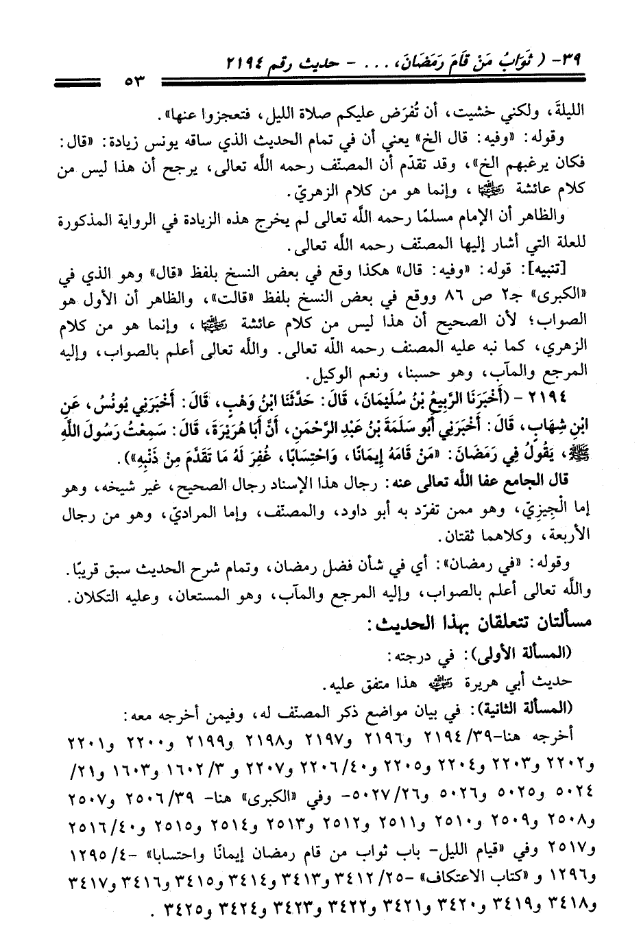 أخرجه هنا-39/ 2194 و 2196 و 2197 و 2198 و 2199 و 2200 و 2201 و 2202 و 2203 و 2204 و2205 و 40/ 2206 و 2207 و 3/ 1602 و 1603 و 21/ 5024 و 5025 و 5026 و 26/ 5027 - وفي "الكبرى" هنا- 39/ 2506 و 2507 و 2508 و 2509 و 2510 و2511 و2512 و2513 و2514 و 2515 و 40/ 2516 و2517 وفي "قيام الليل- باب ثواب من قام رمضان إيمانًا واحتسابًا" -4/ 1295 و 1296 و "كتاب الاعتكاف" -25/ 3412 و 3413 و 3414 و 3415 و3416 و 3417 و 3418 و 3419 و 3420 و3421 و 3422 و 3423 و 3424 و3425.