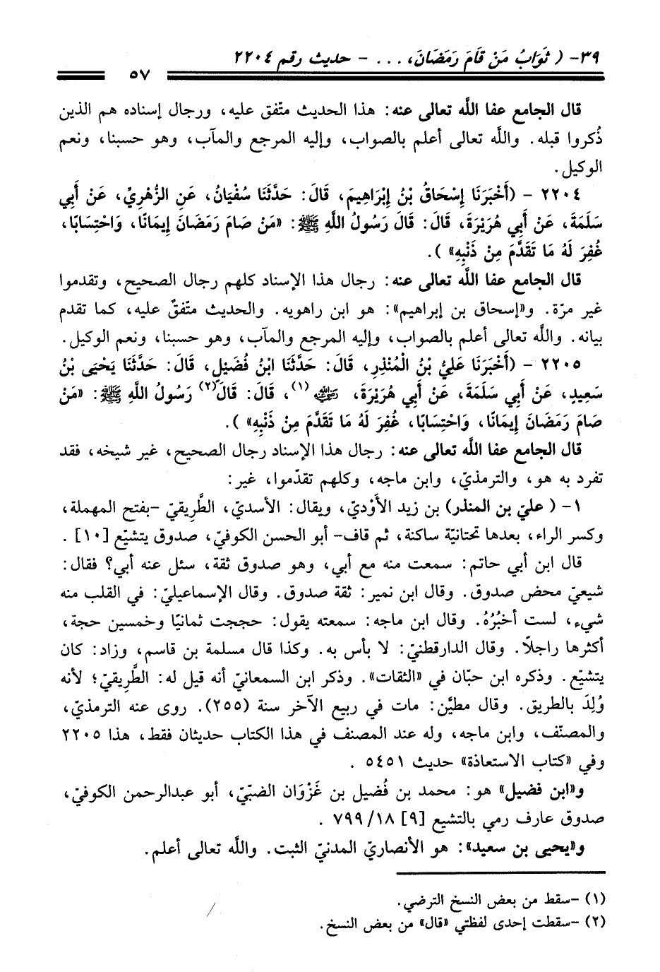 2205 - (أَخْبَرَنَا عَلِيُّ بْنُ الْمُنْذِرِ, قَالَ: حَدَّثَنَا ابْنُ فُضَيْلٍ, قَالَ: حَدَّثَنَا يَحْيَى بْنُ سَعِيدٍ, عَنْ أَبِي سَلَمَةَ, عَنْ أَبِي هُرَيْرَةَ, - رضي اللَّه عنه - (¬1) , قَالَ: قَالَ (¬2) رَسُولُ اللَّهِ - صلى اللَّه عليه وسلم -: «مَنْ صَامَ رَمَضَانَ إِيمَانًا, وَاحْتِسَابًا, غُفِرَ لَهُ مَا تَقَدَّمَ مِنْ ذَنْبِهِ»).