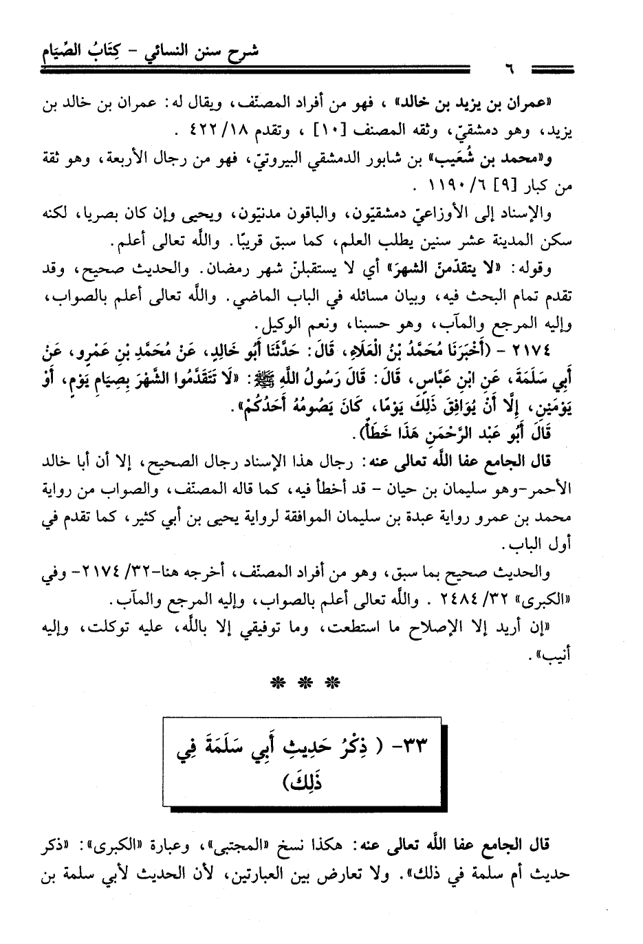 2174 - (أَخْبَرَنَا مُحَمَّدُ بْنُ الْعَلاَءِ, قَالَ: حَدَّثَنَا أَبُو خَالِدٍ, عَنْ مُحَمَّدِ بْنِ عَمْرٍو, عَنْ أَبِي سَلَمَةَ, عَنِ ابْنِ عَبَّاسٍ, قَالَ: قَالَ رَسُولُ اللَّهِ - صلى اللَّه عليه وسلم -: «لاَ تَتَقَدَّمُوا الشَّهْرَ بِصِيَامِ يَوْمٍ, وَلاَ يَوْمَيْنِ, إِلاَّ أَنْ يُوَافِقَ ذَلِكَ يَوْمًا, كَانَ يَصُومُهُ أَحَدُكُمْ». قَالَ أَبُو عَبْدِ الرَّحْمَنِ: هَذَا خَطَأٌ).