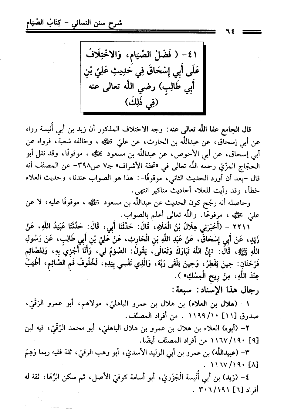 41 - (فَضْلُ الصِّيَامِ، وَالاخْتِلَافُ عَلَى أَبِي إِسْحَاقَ فِي حَدِيثِ علَيِّ بْنِ أَبِي طَالِبٍ) - رضي اللَّه تعالى عنه - (فِي ذَلِكَ)