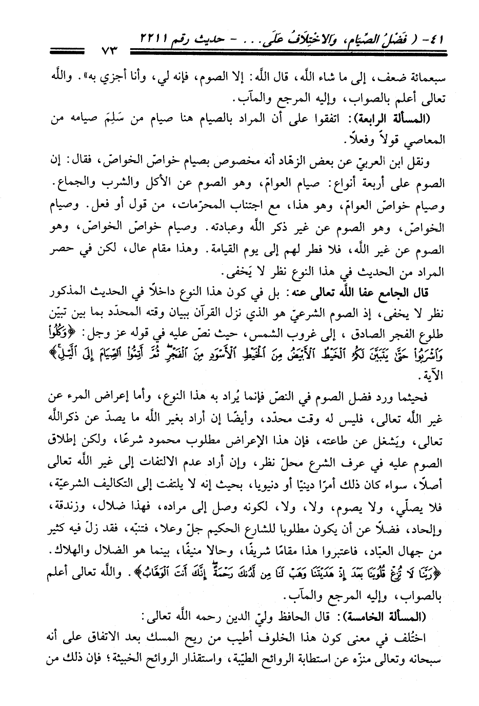(المسألة الرابعة): اتفقوا على أن المراد بالصيام هنا صيام من سَلِمَ صيامه من المعاصي قولاً وفعلاً.