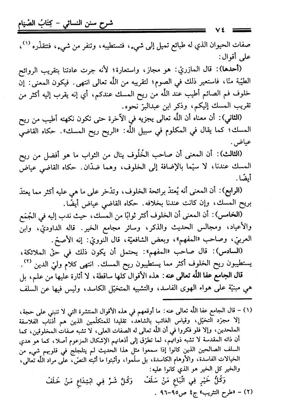 (الخامس): أن المعنى أن الخلوف أكثر ثوابًا من المسك، حيث ندب إليه في الجُمَع والأعياد، ومجالس الحديث والذكر، وسائر مجامع الخير. قاله الداوديّ، وابن العربيّ، وصاحب "المفهم"، وبعض الشافعيّة، قال النوويّ: إنه الأصحّ.