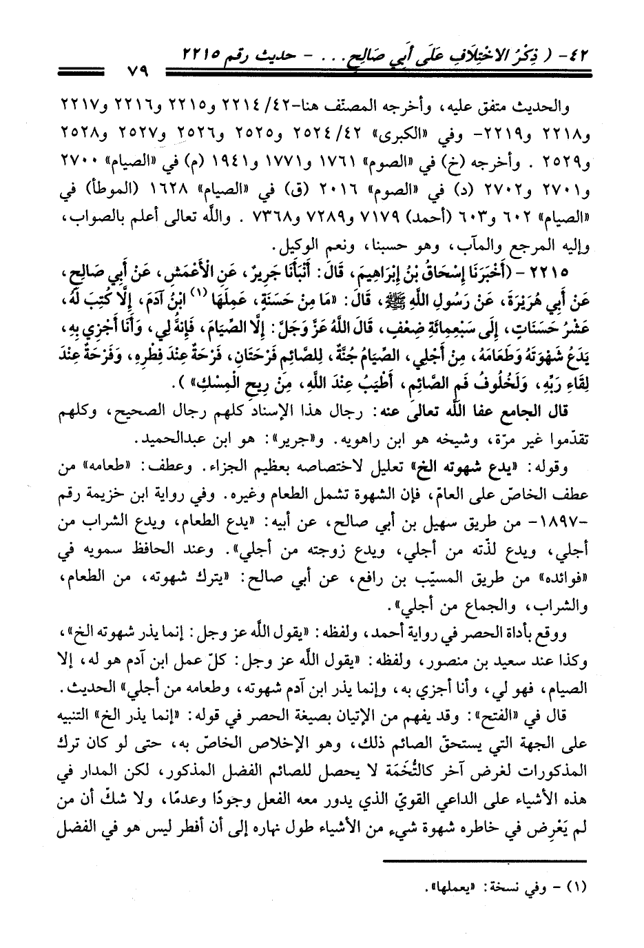 2215 - (أَخْبَرَنَا إِسْحَاقُ بْنُ إِبْرَاهِيمَ, قَالَ: أَنْبَأَنَا جَرِيرٌ, عَنِ الأَعْمَشِ, عَنْ أَبِي صَالِحٍ, عَنْ أَبِي هُرَيْرَةَ, عَنْ رَسُولِ اللَّهِ - صلى اللَّه عليه وسلم -, قَالَ: «مَا مِنْ حَسَنَةٍ, عَمِلَهَا (¬1) ابْنُ آدَمَ, إِلاَّ كُتِبَ لَهُ, عَشْرُ حَسَنَاتٍ, إِلَى سَبْعِمِائَةِ ضِعْفٍ, قَالَ اللَّهُ -عَزَّ وَجَلَّ-: إِلاَّ الصِّيَامَ, فَإِنَّهُ لِي, وَأَنَا أَجْزِي بِهِ, يَدَعُ شَهْوَتَهُ وَطَعَامَهُ, مِنْ أَجْلِي, الصِّيَامُ جُنَّةٌ, لِلصَّائِمِ فَرْحَتَانِ, فَرْحَةٌ عِنْدَ فِطْرِهِ, وَفَرْحَةٌ عِنْدَ لِقَاءِ رَبِّهِ, وَلَخُلُوفُ فَمِ الصَّائِمِ, أَطْيَبُ عِنْدَ اللَّهِ, مِنْ رِيحِ الْمِسْكِ»).