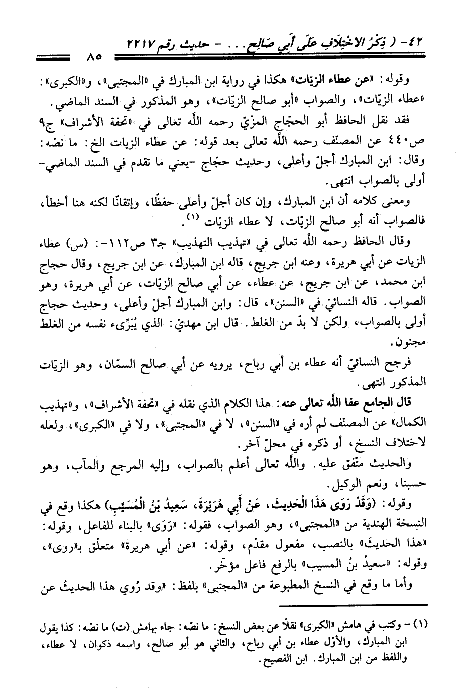 (¬1) - وكتب في هامش "الكبرى" نقلاً عن بعض النسخ: ما نصّه: جاء بهامش (ت) ما نصّه: كذا يقول ابن المبارك، والأوّل عطاء بن أبي رباح، والثاني هو أبو صالح، واسمه ذكوان، لا عطاء، واللفظ من ابن المبارك. ابن الفصيح.