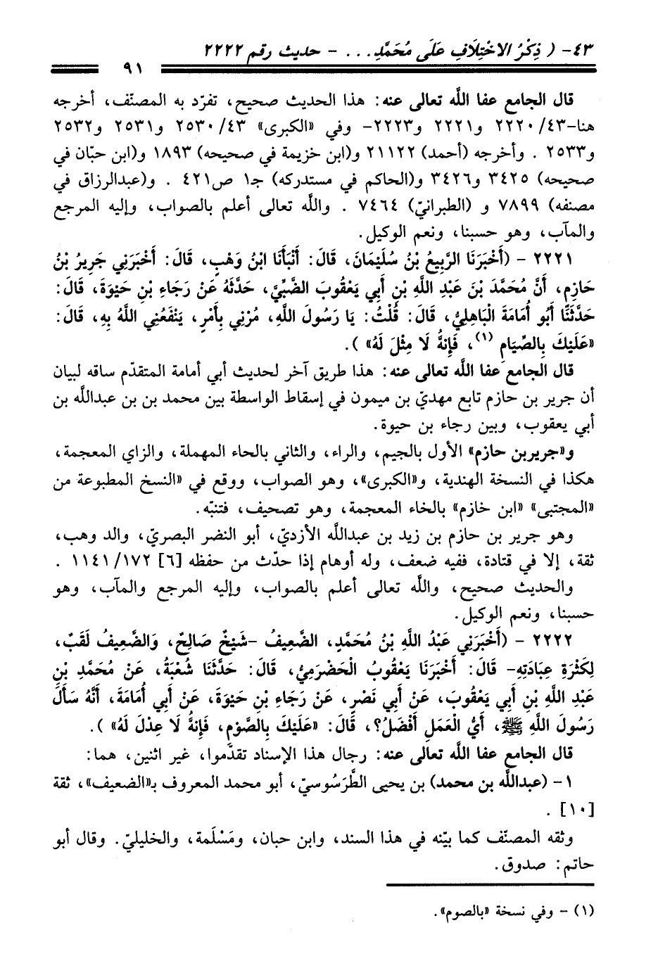 2221 - (أَخْبَرَنَا الرَّبِيعُ بْنُ سُلَيْمَانَ, قَالَ: أَنْبَأَنَا ابْنُ وَهْبٍ, قَالَ: أَخْبَرَنِي جَرِيرُ بْنُ حَازِمٍ, أَنَّ مُحَمَّدَ بْنَ عَبْدِ اللَّهِ بْنِ أَبِي يَعْقُوبَ الضَّبِّيَّ, حَدَّثَهُ عَنْ رَجَاءِ بْنِ حَيْوَةَ, قَالَ: حَدَّثَنَا أَبُو أُمَامَةَ الْبَاهِلِيُّ, قَالَ: قُلْتُ: يَا رَسُولَ اللَّهِ, مُرْنِي بِأَمْرٍ, يَنْفَعُنِي اللَّهُ بِهِ, قَالَ: «عَلَيْكَ بِالصِّيَامِ (¬1) , فَإِنَّهُ لاَ مِثْلَ لَهُ»).