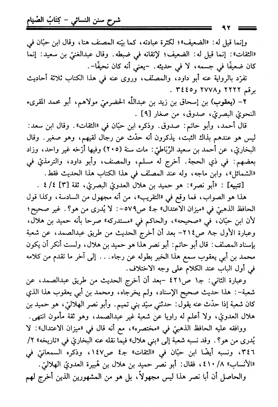وعبارة الثاني: جـ 1ص421 - بعد أن أخرج الحديث من طريق عبد الصمد، عن شعبة-: هذا حديث صحيح الإسناد، ولم يخرجاه، ومحمد بن أبي يعقوب هذا الذي كان شعبة إذا حدّث عنه يقول: حدثني سيّد بني تميم. وأبو نصر الهلاليّ، هو حميد بن هلال العدويّ، ولا أعلم له راويا عن شعبة غير عبد الصمد، وهو ثقة مأمون انتهى.