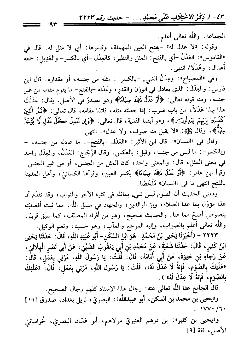 2223 - (أَخْبَرَنَا يَحْيَى بْنُ مُحَمَّدٍ -هُوَ ابْنُ السَّكَنِ- أَبُو عُبَيْدِ اللَّهِ, قَالَ: حَدَّثَنَا يَحْيَى بْنُ كَثِيرٍ, قَالَ: حَدَّثَنَا شُعْبَةُ, عَنْ مُحَمَّدِ بْنِ أَبِي يَعْقُوبَ الضَّبِّيِّ, عَنْ أَبِي نَصْرٍ الْهِلاَلِيِّ, عَنْ رَجَاءِ بْنِ حَيْوَةَ, عَنْ أَبِي أُمَامَةَ, قَالَ: قُلْتُ: يَا رَسُولَ اللَّهِ, مُرْنِي بِعَمَلٍ, قَالَ: «عَلَيْكَ بِالصَّوْمِ, فَإِنَّهُ لاَ عِدْلَ لَهُ» , قُلْتُ: يَا رَسُولَ اللَّهِ, مُرْنِي بِعَمَلٍ, قَالَ: «عَلَيْكَ بِالصَّوْمِ, فَإِنَّهُ لاَ عِدْلَ لَهُ»).