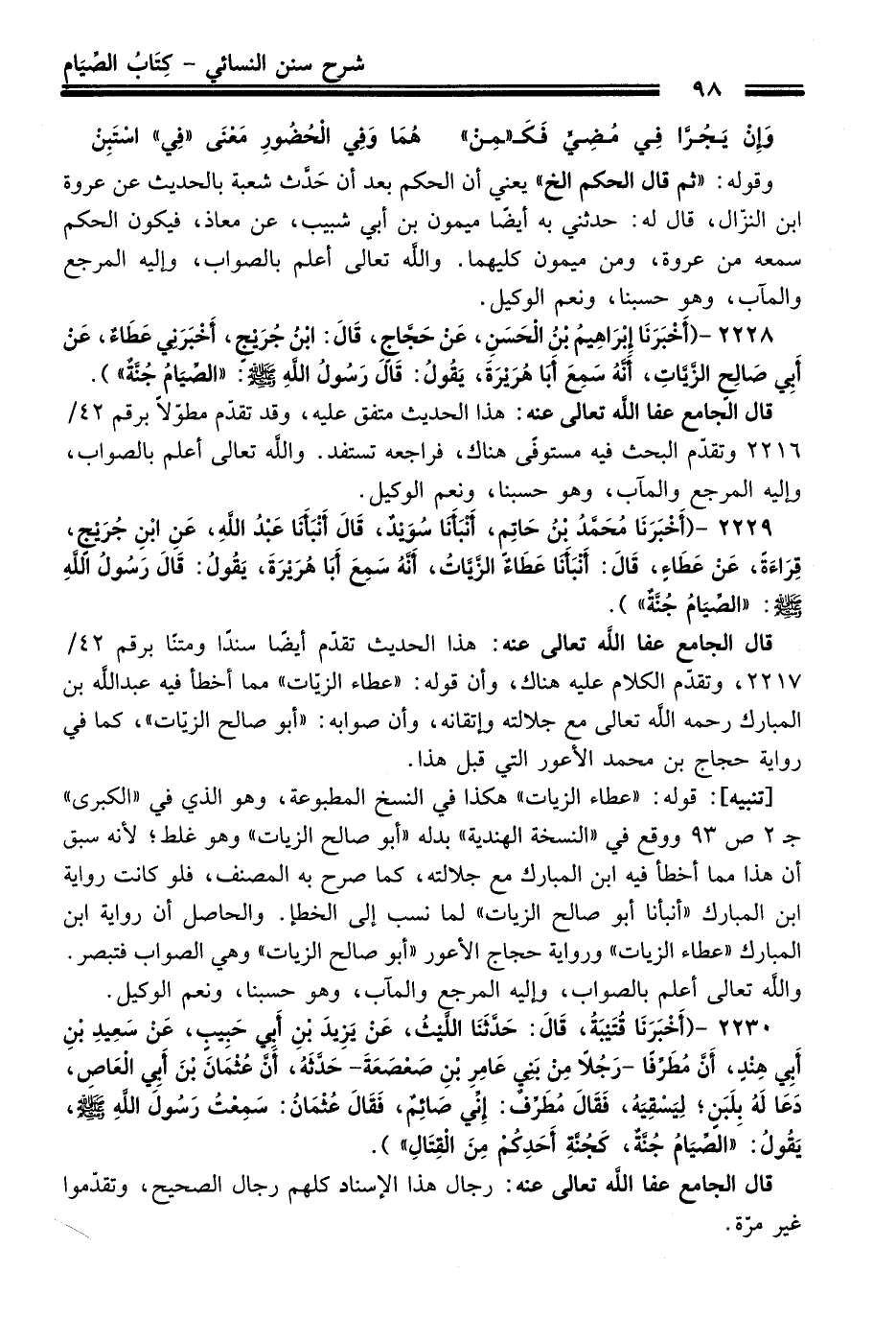 2229 - وَأَخْبَرَنَا مُحَمَّدُ بْنُ حَاتِمٍ, أَنْبَأَنَا سُوَيْدٌ, قَالَ: أَنْبَأَنَا عَبْدُ اللَّهِ, عَنِ ابْنِ جُرَيْجٍ, قِرَاءَةً, عَنْ عَطَاءٍ, قَالَ: أَنْبَأَنَا عَطَاءٌ الزَّيَّاتُ, أَنَّهُ سَمِعَ أَبَا هُرَيْرَةَ, يَقُولُ: قَالَ رَسُولُ اللَّهِ - صلى اللَّه عليه وسلم -: «الصِّيَامُ جُنَّةٌ»).
