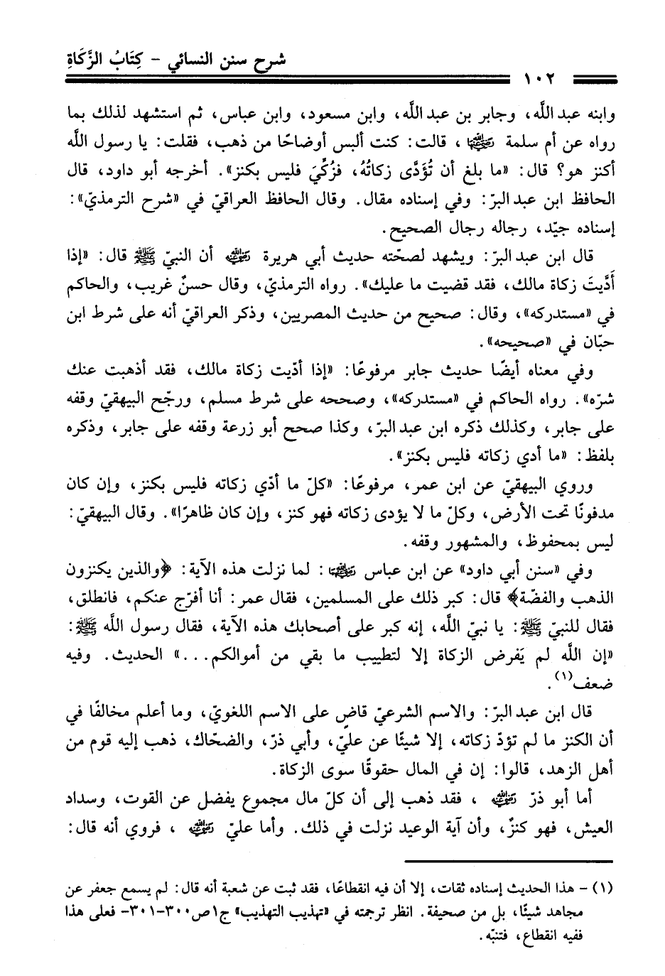 وابنه عبد اللَّه، وجابر بن عبد اللَّه، وابن مسعود، وابن عباس، ثم استشهد لذلك بما رواه عن أم سلمة - رضي اللَّه عنها -، قالت: كنت ألبس أوضاحًا من ذهب، فقلت: يا رسول اللَّه أكنز هو؟ قال: "ما بلغ أن تُؤَدَّى زكاتُهُ، فزُكِّيَ فليس بكنز". أخرجه أبو داود، قال الحافظ ابن عبد البرّ: وفي إسناده مقال. وقال الحافظ العراقيّ في "شرح الترمذيّ": إسناده جيّد، رجاله رجال الصحيح.