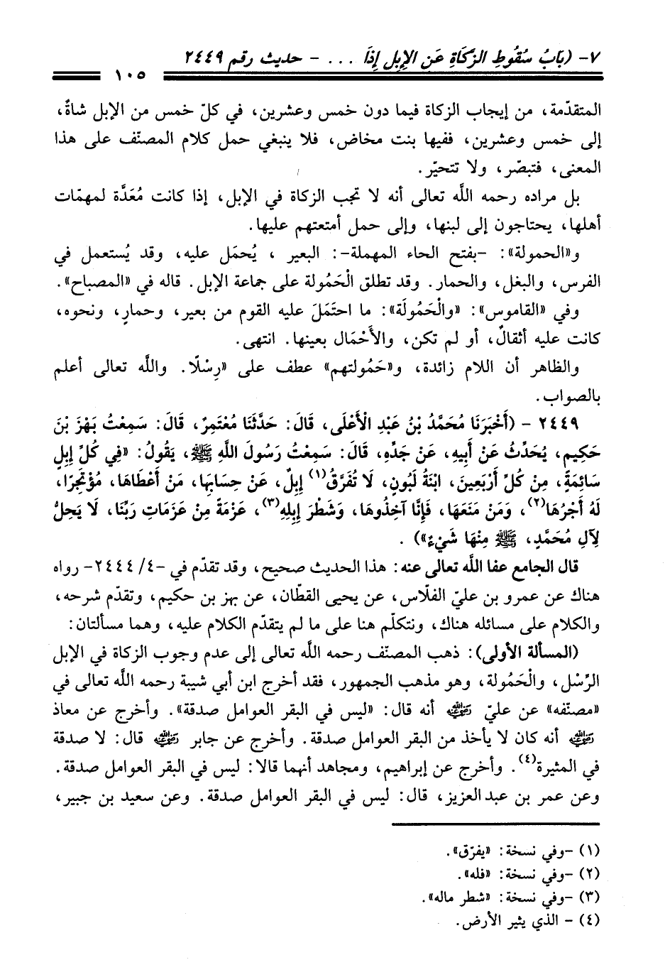 2449 - (أَخْبَرَنَا مُحَمَّدُ بْنُ عَبْدِ الأَعْلَى, قَالَ: حَدَّثَنَا مُعْتَمِرٌ, قَالَ: سَمِعْتُ بَهْزَ بْنَ حَكِيمٍ, يُحَدِّثُ عَنْ أَبِيهِ, عَنْ جَدِّهِ, قَالَ: سَمِعْتُ رَسُولَ اللَّهِ - صلى اللَّه عليه وسلم -, يَقُولُ: «فِي كُلِّ إِبِلٍ سَائِمَةٍ, مِنْ كُلِّ أَرْبَعِينَ, ابْنَةُ لَبُونٍ, لاَ تُفَرَّقُ (¬1) إِبِلٌ, عَنْ حِسَابِهَا, مَنْ أَعْطَاهَا, مُؤْتَجِرًا, لَهُ أَجْرُهَا (¬2) , وَمَنْ مَنَعَهَا, فَإِنَّا آخِذُوهَا, وَشَطْرَ إِبِلِهِ (¬3) , عَزْمَةً مِنْ عَزَمَاتِ رَبِّنَا, لاَ يَحِلُّ لآلِ مُحَمَّدٍ, - صلى اللَّه عليه وسلم - مِنْهَا شَيْءٌ»).