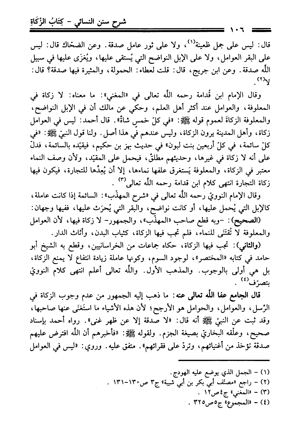 وقال الإمام النوويّ -رحمه اللَّه تعالى- في "شرح المهذّب": السائمة إذا كانت عاملة، كالإبل التي يُحمل عليها، أو كانت نواضح، والبقر التي يُحرَث عليها، ففيها وجهان: