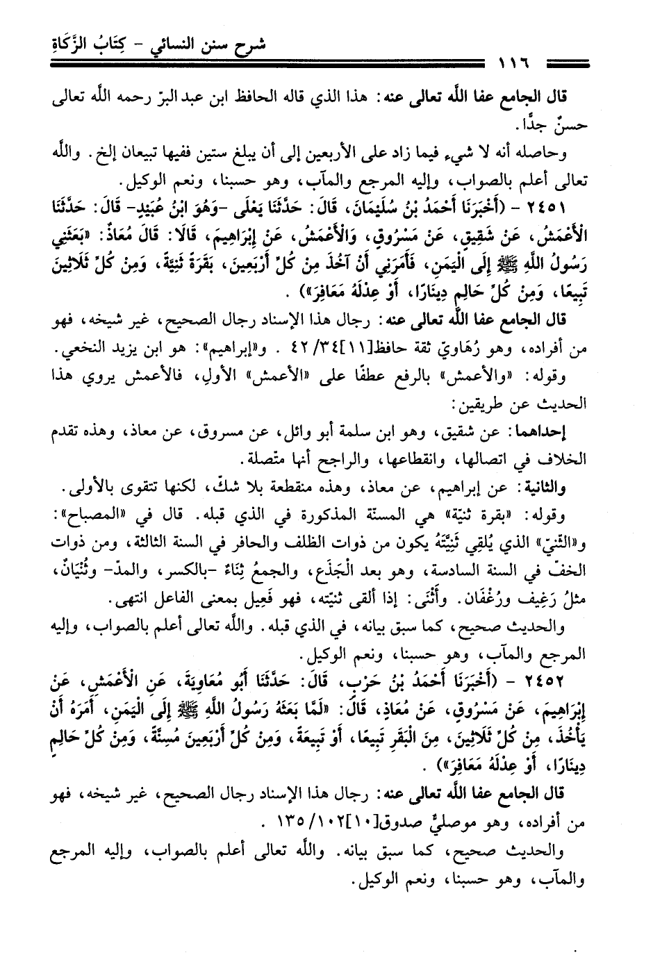 2451 - (أَخْبَرَنَا أَحْمَدُ بْنُ سُلَيْمَانَ, قَالَ: حَدَّثَنَا يَعْلَى -وَهُوَ ابْنُ عُبَيْدٍ- قَالَ: حَدَّثَنَا الأَعْمَشُ, عَنْ شَقِيقٍ, عَنْ مَسْرُوقٍ, وَالأَعْمَشُ, عَنْ إِبْرَاهِيمَ, قَالاَ:: قَالَ: مُعَاذٌ: "بَعَثَنِي رَسُولُ اللَّهِ - صلى اللَّه عليه وسلم - إِلَى الْيَمَنِ, فَأَمَرَنِي أَنْ آخُذَ مِنْ كُلِّ أَرْبَعِينَ, بَقَرَةً ثَنِيَّةً, وَمِنْ كُلِّ ثَلاَثِينَ تَبِيعًا, وَمِنْ كُلِّ حَالِمٍ دِينَارًا, أَوْ عِدْلَهُ مَعَافِرَ").