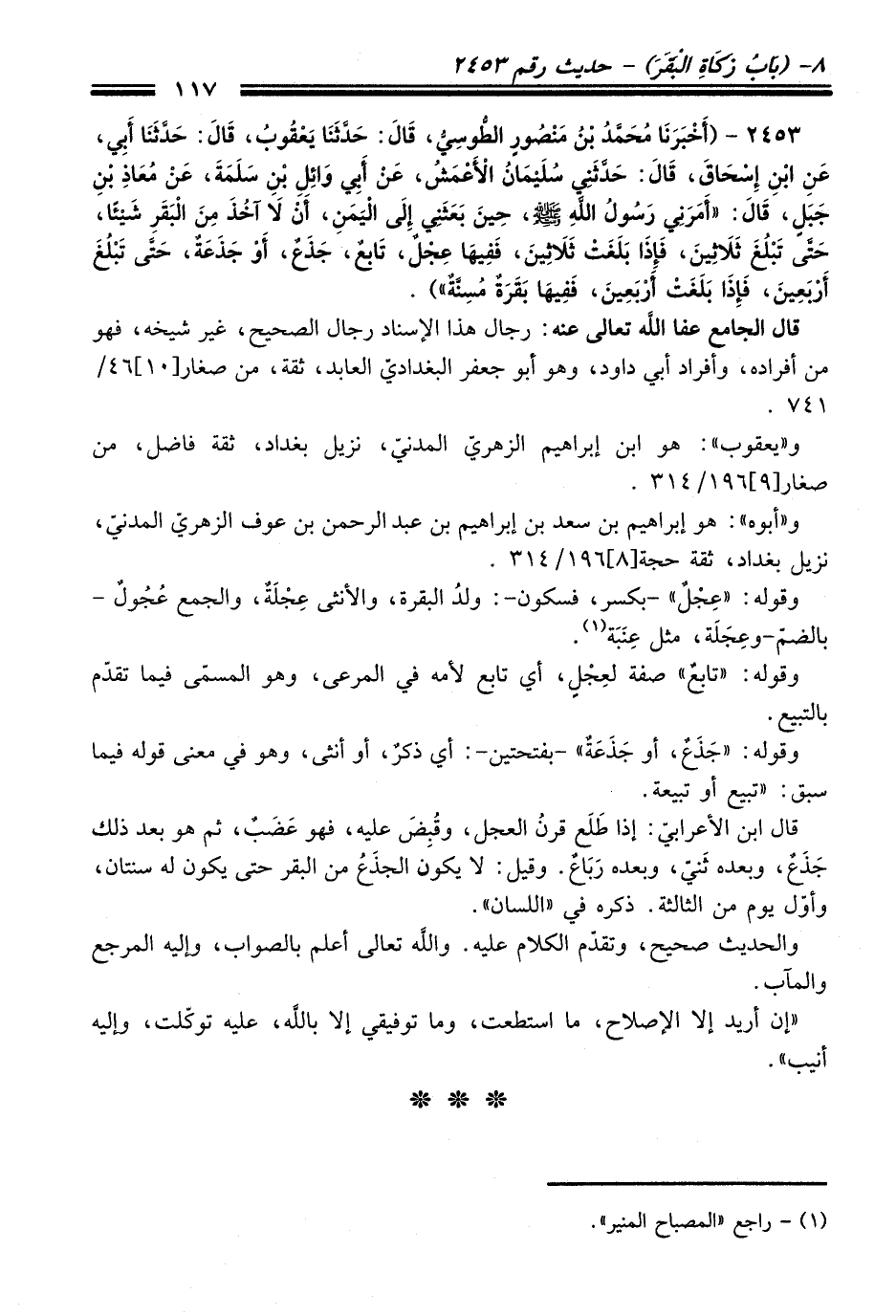 2453 - (أَخْبَرَنَا مُحَمَّدُ بْنُ مَنْصُورٍ الطُّوسِيُّ, قَالَ: حَدَّثَنَا يَعْقُوبُ, قَالَ: حَدَّثَنَا أَبِي, عَنِ ابْنِ إِسْحَاقَ, قَالَ: حَدَّثَنِي سُلَيْمَانُ الأَعْمَشُ, عَنْ أَبِي وَائِلِ بْنِ سَلَمَةَ, عَنْ مُعَاذِ بْنِ جَبَلٍ, قَالَ: "أَمَرَنِي رَسُولُ اللَّهِ - صلى اللَّه عليه وسلم -, حِينَ بَعَثَنِي إِلَى الْيَمَنِ, أَنْ لاَ آخُذَ مِنَ الْبَقَرِ شَيْئًا, حَتَّى تَبْلُغَ ثَلاَثِينَ, فَإِذَا بَلَغَتْ ثَلاَثِينَ, فَفِيهَا عِجْلٌ, تَابِعٌ, جَذَعٌ, أَوْ جَذَعَةٌ, حَتَّى تَبْلُغَ أَرْبَعِينَ, فَإِذَا بَلَغَتْ أَرْبَعِينَ, فَفِيهَا بَقَرَةٌ مُسِنَّةٌ").