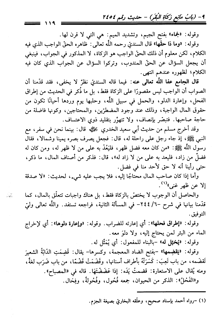 قال الجامع - عفا اللَّه تعالى عنه -: فيما قاله السنديّ نظرٌ لا يخفى، فقد قدّمنا أن الصواب أن الواجب ليس مقصورًا على الزكاة فقط، بل ما ذُكر في الحديث من إطراق الفحل، وإعارة الدلو، والحمل في سبيل اللَّه، وحلبها يوم وردها أحيانًا تكون من حقوق المال الواجبة، وذلك عند وجود المضطرّين، والمحتاجين، وكونها فاضلة من حاجة صاحبها. فتبصّر بإنصاف، ولا تتهوَّر بتقليد ذوي الاعتساف.