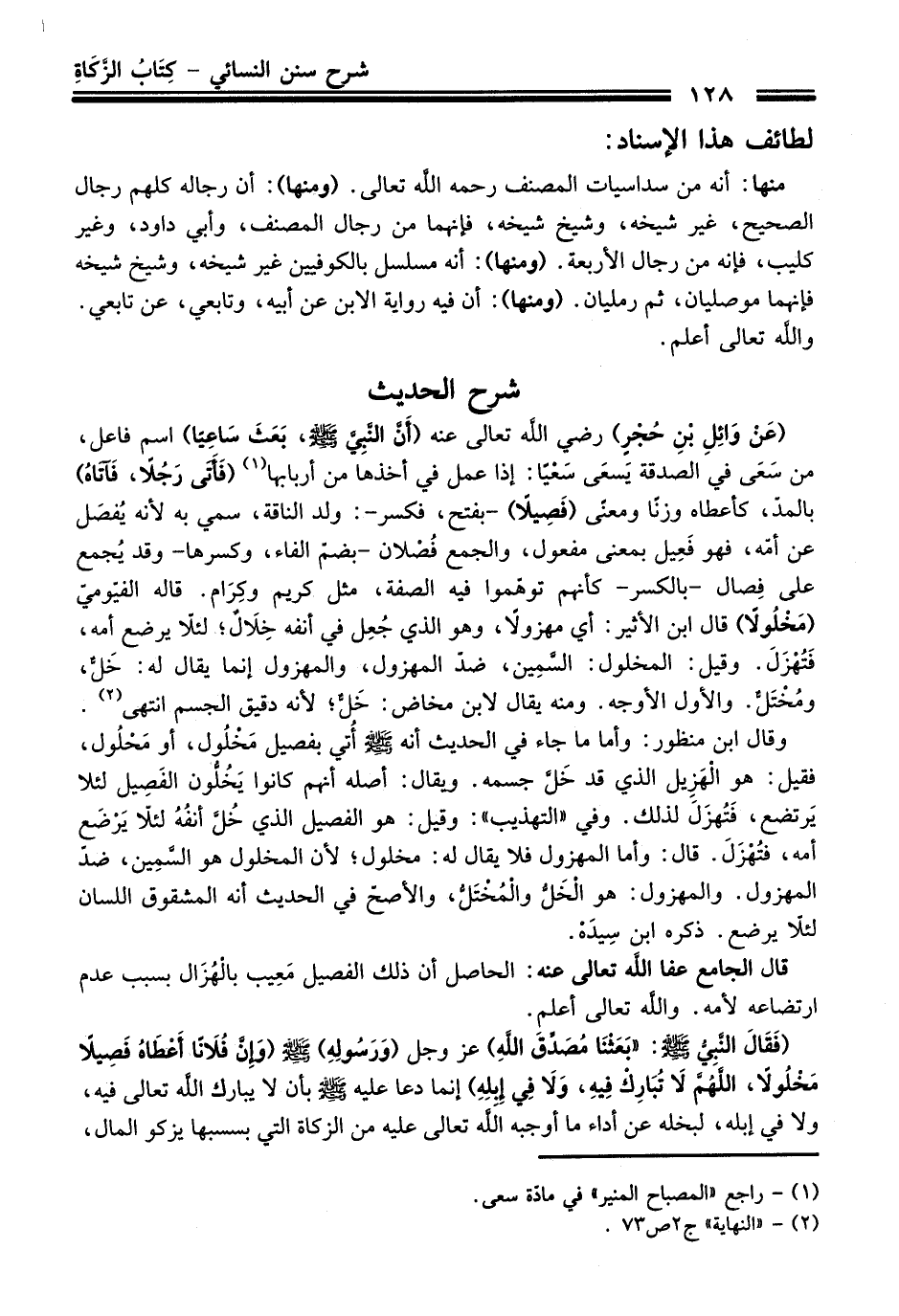 (عَنْ وَائِلِ بْنِ حُجْرٍ) - رضي اللَّه تعالى عنه - (أَنَّ النَّبِيَّ - صلى اللَّه عليه وسلم -، بَعَثَ سَاعِيًا) اسم فاعل، من سَعَى في الصدقة يَسعَى سَعْيًا: إذا عمل في أخذها من أربابها (¬1) (فَأَتَى رَجُلاً، فَآتاهُ) بالمدّ، كأعطاه وزنًا ومعنى (فَصِيلاً) -بفتح، فكسر-: ولد الناقة، سمي به لأنه يُفصَل عن أمّه، فهو فَعِيل بمعنى مفعول، والجمع فُصْلان -بضمّ الفاء، وكسرها- وقد يُجمع على فِصال -بالكسر- كأنهم توهّموا فيه الصفة، مثل كريم وكِرَام. قاله الفيّوميّ (مَخْلُولاً) قال ابن الأثير: أي مهزولاً، وهو الذي جُعِل في أنفه خِلَالٌ؛ لئلّا يرضع أمه، فَتُهْزَلَ. وقيل: المخلول: السَّمِين، ضدّ المهزول، والمهزول إنما يقال له: خَلٌّ، ومُخْتَلٌّ. والأول الأوجه. ومنه يقال لابن مخاض: خَلٌّ؛ لأنه دقيق الجسم انتهى (¬2).