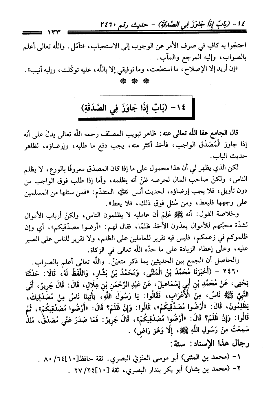 2460 - (أَخْبَرَنَا مُحَمَّدُ بْنُ الْمُثَنَّى, وَمُحَمَّدُ بْنُ بَشَّارٍ, وَاللَّفْظُ لَهُ, قَالاَ: حَدَّثَنَا يَحْيَى, عَنْ مُحَمَّدِ بْنِ أَبِي إِسْمَاعِيلَ, عَنْ عَبْدِ الرَّحْمَنِ بْنِ هِلاَلٍ, قَالَ: قَالَ: جَرِيرٌ, أَتَى النَّبِيَّ - صلى اللَّه عليه وسلم - نَاسٌ, مِنَ الأَعْرَابِ, فَقَالُوا: يَا رَسُولَ اللَّهِ, يَأْتِينَا نَاسٌ مِنْ مُصَدِّقِيكَ, يَظْلِمُونَ, قَالَ: «أَرْضُوا مُصَدِّقِيكُمْ» , قَالُوا: وَإِنْ ظَلَمَ؟ قَالَ: «أَرْضُوا مُصَدِّقِيكُمْ» , ثُمَّ قَالُوا: وَإِنْ ظَلَمَ؟ قَالَ: «أَرْضُوا مُصَدِّقِيكُمْ» , قَالَ جَرِيرٌ: فَمَا صَدَرَ عَنِّي مُصَدِّقٌ, مُنْذُ سَمِعْتُ مِنْ رَسُولِ اللَّهِ - صلى اللَّه عليه وسلم -, إِلاَّ وَهُوَ رَاضٍ).