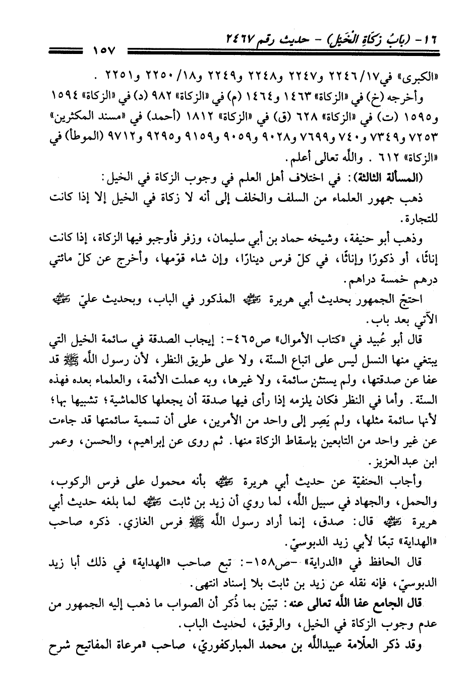 وأجاب الحنفيّة عن حديث أبي هريرة - رضي اللَّه عنه - بأنه محمول على فرس الركوب، والحمل، والجهاد في سبيل اللَّه، لما روي أن زيد بن ثابت - رضي اللَّه عنه - لما بلغه حديث أبي هريرة - رضي اللَّه عنه - قال: صدق، إنما أراد رسول اللَّه - صلى اللَّه عليه وسلم - فرس الغازي. ذكره صاحب "الهداية" تبعًا لأبي زيد الدبوسيّ.