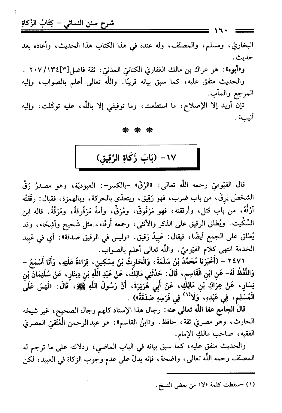 2471 - (أَخْبَرَنَا مُحَمَّدُ بْنُ سَلَمَةَ, وَالْحَارِثُ بْنُ مِسْكِينٍ, قِرَاءَةً عَلَيْهِ, وَأَنَا أَسْمَعُ - وَاللَّفْظُ لَهُ- عَنِ ابْنِ الْقَاسِمِ, قَالَ: حَدَّثَنِي مَالِكٌ, عَنْ عَبْدِ اللَّهِ بْنِ دِينَارٍ, عَنْ سُلَيْمَانَ بْنِ يَسَارٍ, عَنْ عِرَاكِ بْنِ مَالِكٍ, عَنْ أَبِي هُرَيْرَةَ, أَنَّ رَسُولَ اللَّهِ - صلى اللَّه عليه وسلم -, قَالَ: «لَيْسَ عَلَى الْمُسْلِمِ, فِي عَبْدِهِ, وَلاَ (¬1) فِي فَرَسِهِ صَدَقَةٌ»).