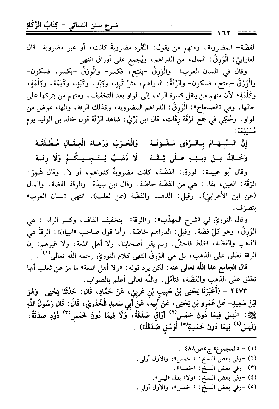 2473 - (أَخْبَرَنَا يَحْيَى بْنُ حَبِيبِ بْنِ عَرَبِيٍّ, عَنْ حَمَّادٍ, قَالَ: حَدَّثَنَا يَحْيَى -وَهُوَ ابْنُ سَعِيدٍ- عَنْ عَمْرِو بْنِ يَحْيَى, عَنْ أَبِيهِ, عَنْ أَبِي سَعِيدٍ الْخُدْرِيِّ, قَالَ: قَالَ رَسُولُ اللَّهِ - صلى اللَّه عليه وسلم -: «لَيْسَ فِيمَا دُونَ خَمْسَةِ (¬2) أَوَاقٍ صَدَقَةٌ, وَلاَ فِيمَا دُونَ خَمْسِ (¬3) ذَوْدٍ صَدَقَةٌ, وَلَيْسَ (¬4) فِيمَا دُونَ خَمْسِةِ (¬5) أَوْسُقٍ صَدَقَةٌ»).