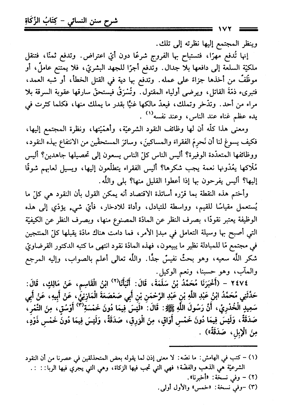 (¬1) - كتب في الهامش: ما نصّه: لا معنى إذن لما يقوله بعض المتحذلقين في عصرنا من أن النقود الشرعيّة هي الذهب والفضّة؛ فهي التي تجب فيها الزكاة، وهي التي يجري فيها الربا.