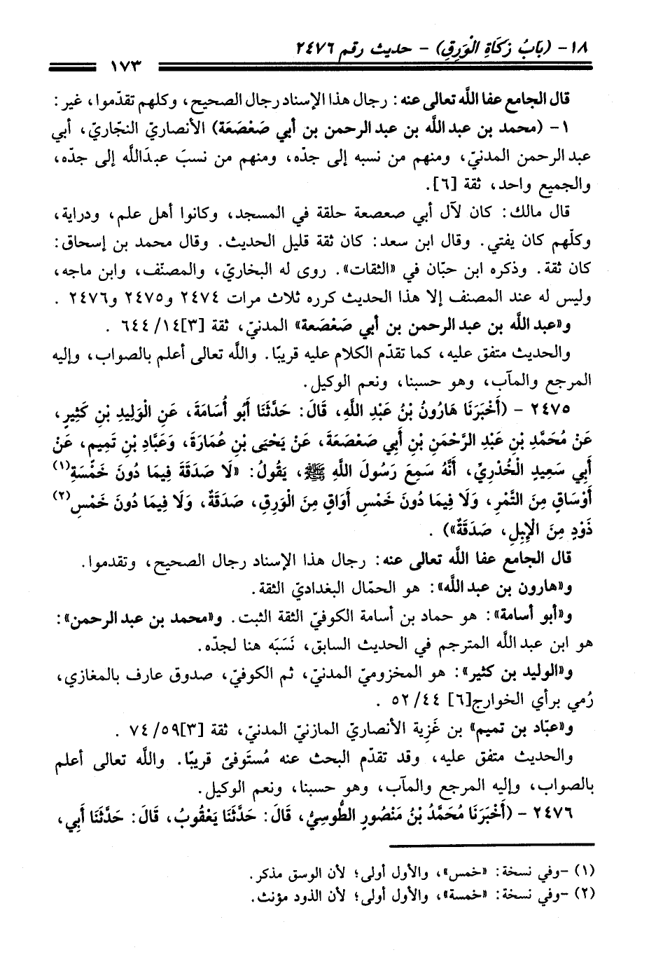 2475 - (أَخْبَرَنَا هَارُونُ بْنُ عَبْدِ اللَّهِ, قَالَ: حَدَّثَنَا أَبُو أُسَامَةَ, عَنِ الْوَلِيدِ بْنِ كَثِيرٍ, عَنْ مُحَمَّدِ بْنِ عَبْدِ الرَّحْمَنِ بْنِ أَبِي صَعْصَعَةَ, عَنْ يَحْيَى بْنِ عُمَارَةَ, وَعَبَّادِ بْنِ تَمِيمٍ, عَنْ أَبِي سَعِيدٍ الْخُدْرِيِّ, أَنَّهُ سَمِعَ رَسُولَ اللَّهِ - صلى اللَّه عليه وسلم -, يَقُولُ: «لاَ صَدَقَةَ فِيمَا دُونَ خَمْسَةِ (¬1) أَوْسَاقٍ مِنَ التَّمْرِ, وَلاَ فِيمَا دُونَ خَمْسِ أَوَاقٍ مِنَ الْوَرِقِ, صَدَقَةٌ, وَلاَ فِيمَا دُونَ خَمْسِ (¬2) ذَوْدٍ مِنَ الإِبِلِ, صَدَقَةٌ»).