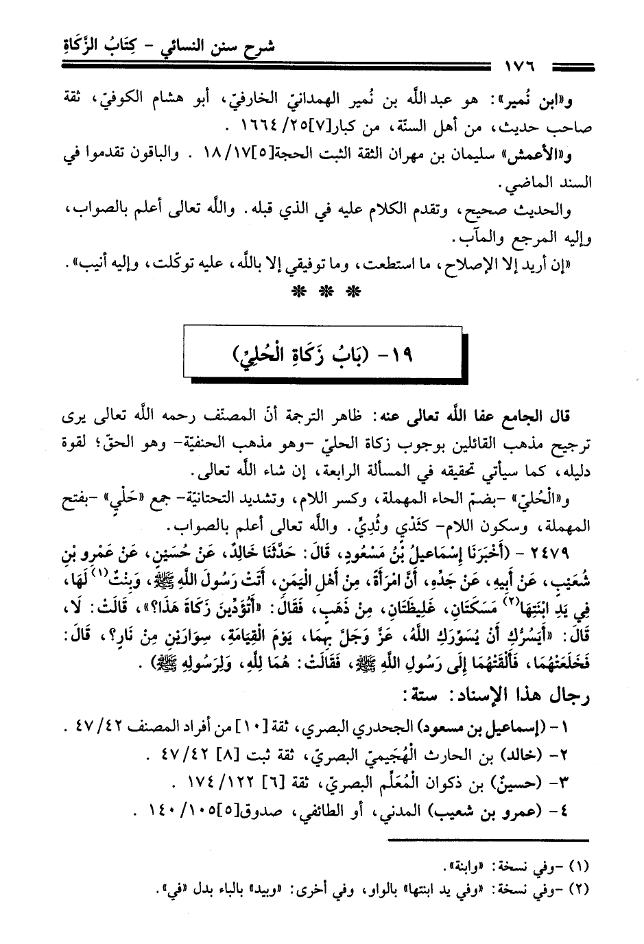 2479 - (أَخْبَرَنَا إِسْمَاعِيلُ بْنُ مَسْعُودٍ, قَالَ: حَدَّثَنَا خَالِدٌ, عَنْ حُسَيْنٍ, عَنْ عَمْرِو بْنِ شُعَيْبٍ, عَنْ أَبِيهِ, عَنْ جَدِّهِ, أَنَّ امْرَأَةً, مِنْ أَهْلِ الْيَمَنِ, أَتَتْ رَسُولَ اللَّهِ - صلى اللَّه عليه وسلم -, وَبِنْتٌ (¬1) لَهَا, فِي يَدِ ابْنَتِهَا (¬2) مَسَكَتَانِ, غَلِيِظَتَانِ, مِنْ ذَهَبٍ, فَقَالَ: «أَتُؤَدِّينَ زَكَاةَ هَذَا؟» , قَالَتْ: لاَ, قَالَ: «أَيَسُرُّكِ أَنْ يُسَوِّرَكِ اللَّهُ, -عَزَّ وَجَلَّ- بِهِمَا, يَوْمَ الْقِيَامَةِ, سِوَارَيْنِ مِنْ نَارٍ؟» , قَالَ: فَخَلَعَتْهُمَا, فَأَلْقَتْهُمَا إِلَى رَسُولِ اللَّهِ - صلى اللَّه عليه وسلم - فَقَالَتْ: هُمَا لِلَّهِ, وَلِرَسُولِهِ - صلى اللَّه عليه وسلم -).