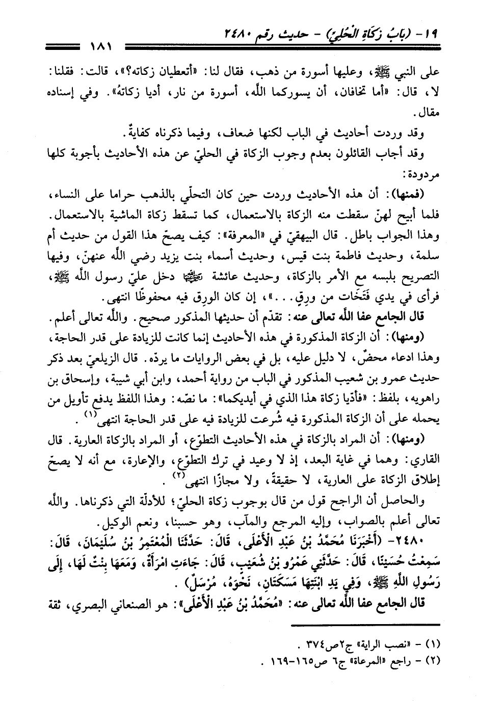 (ومنها): أن الزكاة المذكورة في هذه الأحاديث إنما كانت للزيادة على قدر الحاجة، وهذا ادعاء محضٌ، لا دليل عليه، بل في بعض الروايات ما يردّه. قال الزيلعيّ بعد ذكر حديث عمرو بن شعيب المذكور في الباب من رواية أحمد، وابن أبي شيبة، وإسحاق بن راهويه، بلفظ: "فأدّيا زكاة هذا الذي في أيديكما": ما نصّه: وهذا اللفظ يدفع تأويل من يحمله على أن الزكاة المذكورة فيه شُرعت للزيادة فيه على قدر الحاجة انتهى (¬1).