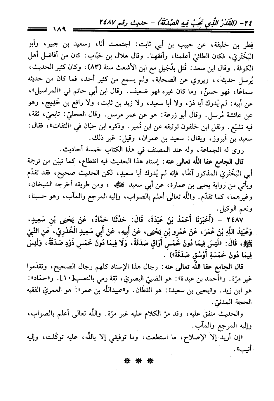 2487 - (أَخْبَرَنَا أَحْمَدُ بْنُ عَبْدَةَ, قَالَ: حَدَّثَنَا حَمَّادٌ, عَنْ يَحْيَى بْنِ سَعِيدٍ, وَعُبَيْدِ اللَّهِ بْنِ عُمَرَ, عَنْ عَمْرِو بْنِ يَحْيَى, عَنْ أَبِيهِ, عَنْ أَبِي سَعِيدٍ الْخُدْرِيِّ, عَنِ النَّبِيِّ - صلى اللَّه عليه وسلم -, قَالَ: «لَيْسَ فِيمَا دُونَ خَمْسِ أَوَاقٍ صَدَقَةٌ, وَلاَ فِيمَا دُونَ خَمْسِ ذَوْدٍ صَدَقَةٌ, وَلَيْسَ فِيمَا دُونَ خَمْسَةِ أَوْسُقٍ صَدَقَةٌ»).