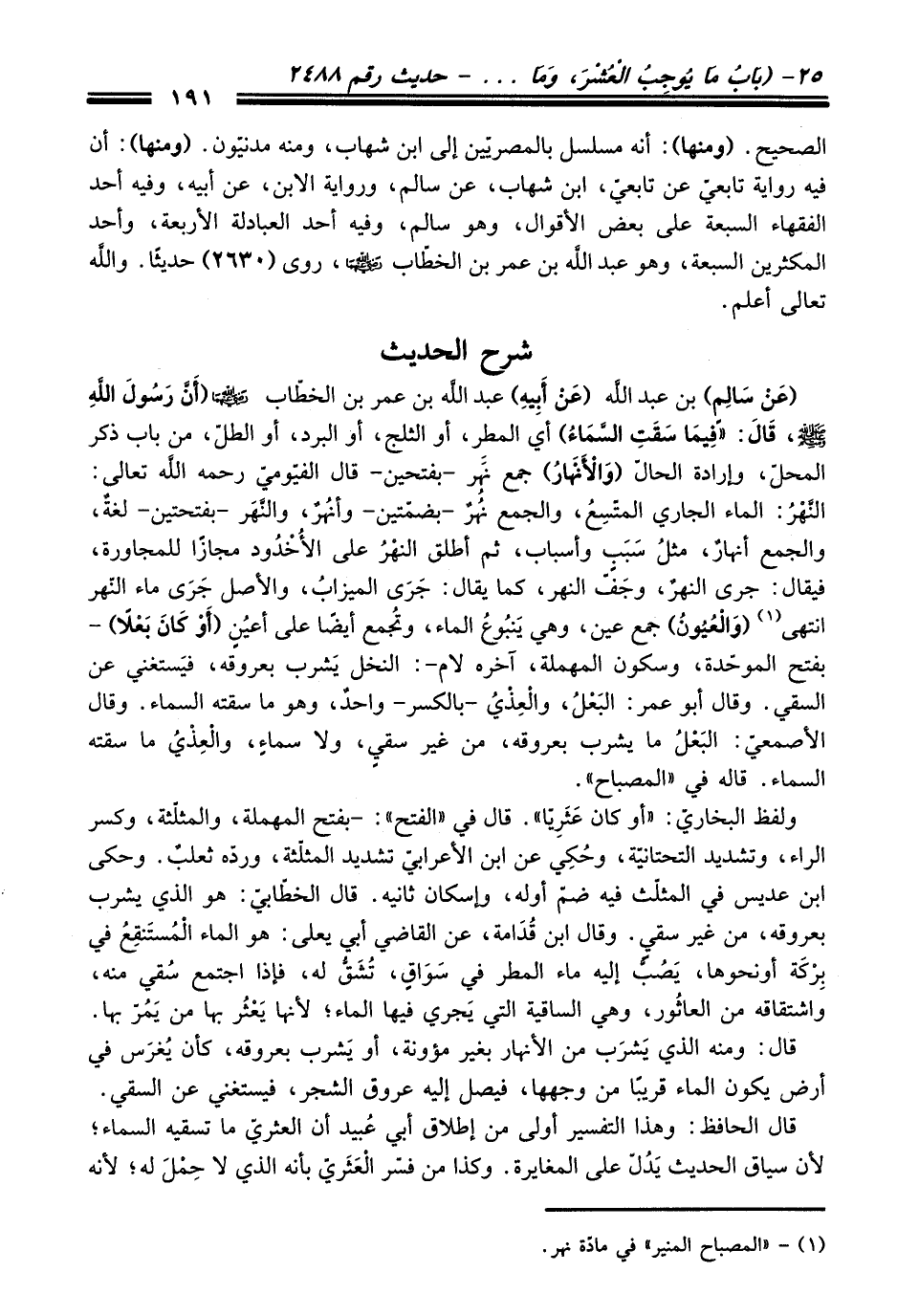 (عَنْ سَالِمٍ) بن عبد اللَّه (عَنْ أَبِيهِ) عبد اللَّه بن عمر بن الخطّاب - رضي اللَّه عنهما - (أَنَّ رَسُولَ اللَّهِ - صلى اللَّه عليه وسلم -، قَالَ: "فِيمَا سَقَتِ السَّمَاءُ) أي المطِر، أو الثلج، أو البرد، أو الطلّ، من باب ذكر المحلّ، وإرادة الحالّ (وَالْأَنْهَارُ) جمع نَهر -بفتحين- قال الفيّوميّ -رحمه اللَّه تعالى-: النَّهْرُ: الماء الجاري المتّسِعُ، والجمع نهُرٌ -بضمّتين- وأنُهرْ، والنَّهَر -بفتحتين- لغةٌ، والجمع أنهارٌ، مثلُ سَبَبٍ وأسباب، ثم أطلق النهْرُ على الأُخْدُود مجازًا للمجاورة، فيقال: جرى النهرٌ، وجَفّ النهر، كما يقال: جَرَى الميزابُ، والأصل جَرَى ماء النّهر انتهى (¬1) (وَالْعُيُونُ) جمع عين، وهي يَنبُوعُ الماء، وتُجمع أيضًا على أعيُنٍ (أَوْ كَانَ بَعْلَا) - بفتح الموحّدة، وسكون المهملة، آخره لام-: النخل يَشرب بعروقه، فيَستغني عن السقي. وقال أبو عمر: البَعْلُ، والْعِذْيُ -بالكسر- واحدٌ، وهو ما سقته السماء. وقال الأصمعيّ: البَعْلُ ما يشرب بعروقه، من غير سقيٍ، ولا سماءٍ، والْعِذْيُ ما سقته السماء. قاله في "المصباح".