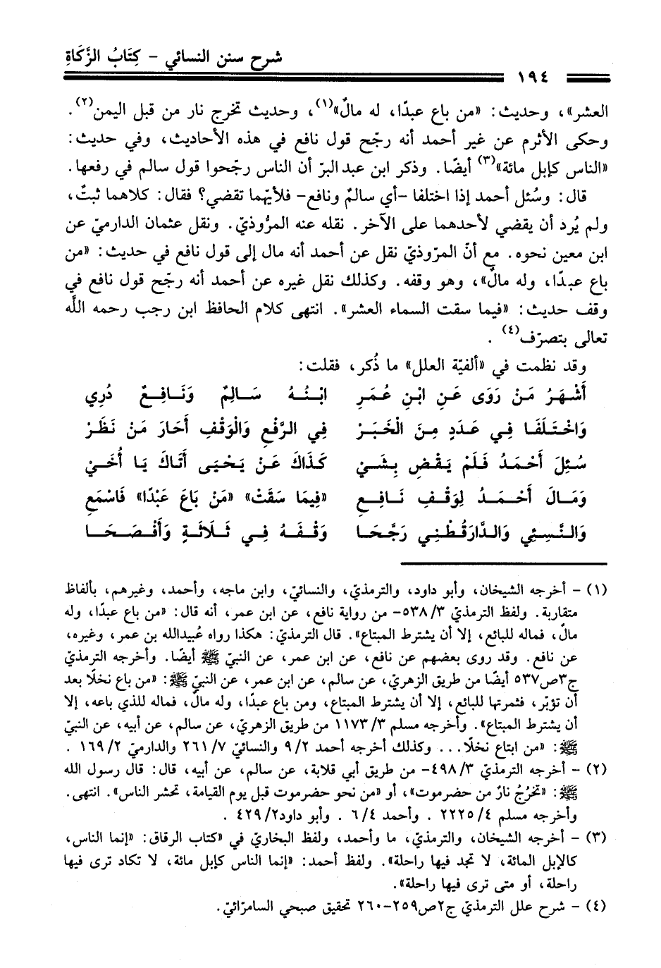 العشر"، وحديث: "من باع عبدًا، له مالٌ" (¬1)، وحديث تخرج نار من قبل اليمن (¬2). وحكى الأثرم عن غير أحمد أنه رجّح قول نافع في هذه الأحاديث، وفي حديث: "الناس كإبل مائة" (¬3) أيضًا. وذكر ابن عبد البرّ أن الناس رجّحوا قول سالم في رفعها. قال: وسُئل أحمد إذا اختلفا -أي سالمٌ ونافع- فلأيّهما تقضي؟ فقال: كلاهما ثبتٌ، ولم يُرد أن يقضي لأحدهما على الآخر. نقله عنه المرُّوذيّ. ونقل عثمان الدارميّ عن ابن معين نحوه. مع أنّ المرّوذيّ نقل عن أحمد أنه مال إلى قول نافع في حديث: "من باع عبدًا، وله مالٌ"، وهو وقفه. وكذلك نقل غيره عن أحمد أنه رجّح قول نافع في وقف حديث: "فيما سقت السماء العشر". انتهى كلام الحافظ ابن رجب -رَحِمَهُ اللَّهُ- تعالى بتصرّف (¬4).