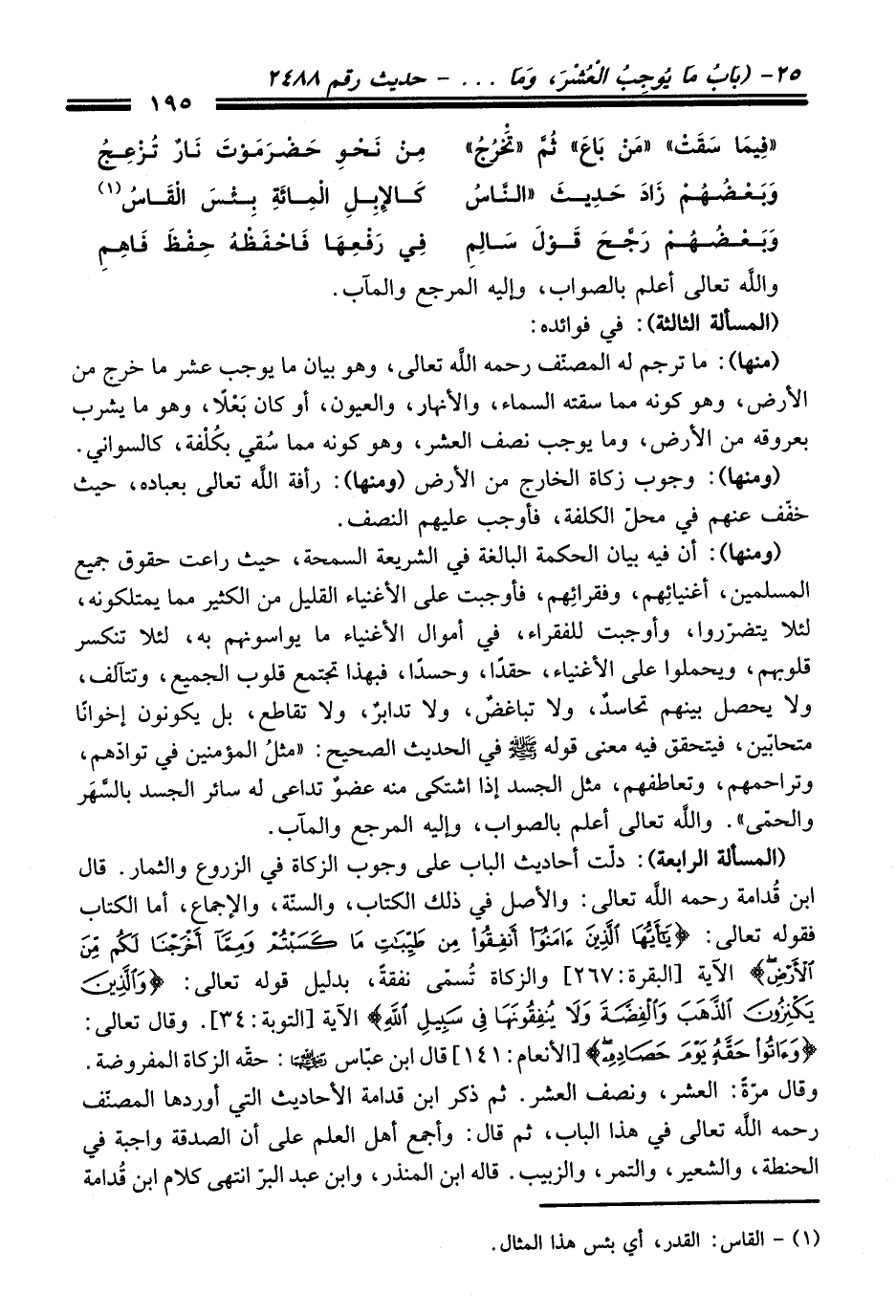 (منها): ما ترجم له المصنّف -رحمه اللَّه تعالى-، وهو بيان ما يوجب عشر ما خرج من الأرض، وهو كونه مما سقته السماء، والأنهار، والعيون، أو كان بَعْلاً، وهو ما يشرب بعروقه من الأرض، وما يوجب نصف العشر، وهو كونه مما سُقي بكُلْفة، كالسواني.