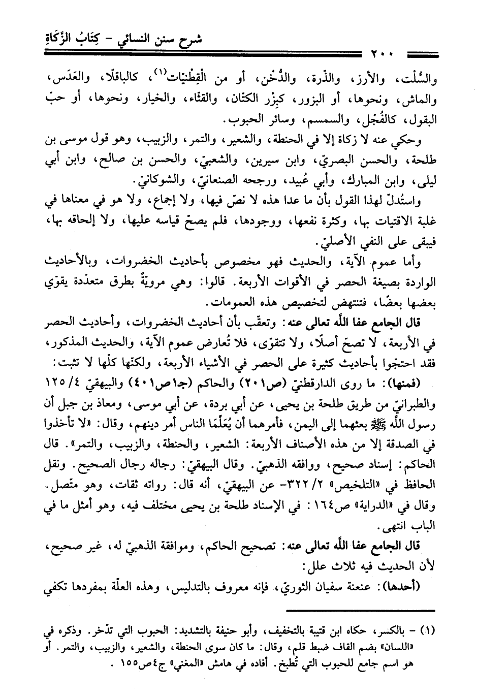 (فمنها): ما روى الدارقطنيّ (ص 201) والحاكم (جـ 1 ص 401) والبيهقيّ 4/ 125 والطبرانيّ من طريق طلحة بن يحيى، عن أبي بردة، عن أبي موسى، ومعاذ بن جبل أن رسول اللَّه - صلى اللَّه عليه وسلم - بعثهما إلى اليمن، فأمرهما أن يُعَلِّمَا الناس أمر دينهم، وقال: "لا تأخذوا في الصدقة إلا من هذه الأصناف الأربعة: الشعير، والحنطة، والزبيب، والتمر". قال الحاكم: إسناد صحيح، ووافقه الذهبيّ. وقال البيهقيّ: رجاله رجال الصحيح. ونقل الحافظ في "التلخيص" 2/ 322 - عن البيهقيّ، أنه قال: رواته ثقات، وهو متّصل. وقال في "الدراية" ص 164: في الإسناد طلحة بن يحيى مختلف فيه، وهو أمثل ما في الباب انتهى.